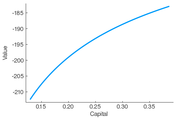 class: center, middle, inverse, title-slide # Lecture 7 ## Solution methods for discrete time dynamic models ### Ivan Rudik ### AEM 7130 --- # Roadmap 1. How do we think about solving dynamic economic models 2. Value function iteration 3. Fixed point iteration 4. Time iteration 5. VFI + discretization --- # Things to do 1. Install: `LinearAlgebra, Optim, Plots, Roots` -- 2. Keep in mind that for VFI and TI we will be using optimization/rootfinding packages + This matters because these packages typically only let the functions they work on have one input: the guesses for the maximizing input or root + We get around this by expressing the function as a *closure* + i.e. declare the function inside of a wrapper function that does the maximization/rootfinding so it can access the parameters in the wrapper function -- 3. Keep in mind we will be working with about the simplest example possible, more complex problems will be more difficult to solve in many ways --- # Solutions to economic models How do we solve economic models? -- First, what do we want? -- We want to be able to compute things like optimal policy trajectories, welfare, etc -- There are generally two objects that can deliver what we want: 1. Value functions 2. Policy functions -- The idea behind the most commonly used solution concepts is to recover good approximations to one of these two functions --- # Solutions to economic models We recover these functions by exploiting two things: 1. Dynamic equilibrium conditions incorporating these functions (e.g. Bellman equations, Euler equations) 2. Fixed points -- First lets look at recovering the value function --- # Our general example Consider the following problem we will be using for all of these solution methods: `\begin{gather} \max_{\left\{c_t \right\}_{t=0}^\infty} \sum_{t=1}^\infty \beta^t u(c_t) \notag \\ \text{subject to:} \,\,\,\,\, k_{t+1} = f(k_t) - c_t \notag \end{gather}` where both consumption and time `\(t+1\)` capital are positive, `\(k(0) = k_0\)`, `\(\alpha > 0\)`, and `\(\beta \in (0,1)\)` --- # Our general example Represent the growth model as a Bellman equation `\begin{gather} V(k) = \max_{c} u(c) + \beta V(k') \notag \\ \text{subject to:} \,\,\,\,\, k' = f(k) - c \notag \end{gather}` -- we can reduce this to `$$V(k) = \max_{c} u(c) + \beta V(f(k) - c)$$` --- # Method 1: Value function iteration In VFI we approximate the .hi-blue[value function] with some flexible functional form `\(\Gamma(k_t;b)\)` where `\(b\)` is a vector of coefficients The algorithm has 6 steps --- # Method 1: Value function iteration .hi-blue[Step 1:] Select the number of collocation points in each dimension and the domain of the approximation space -- .hi-blue[Step 2:] Select an initial vector of coefficients `\(b_0\)` with the same number of elements as the collocation grid, and initial guesses for consumption for the solver -- .hi-blue[Step 3:] Select a rule for convergence -- .hi-blue[Step 4:] Construct the grid and basis matrix --- # Method 1: Value function iteration .hi-blue[Step 5:] While convergence criterion `\(>\)` tolerance **(outer loop)** + Start iteration `\(p\)` + For each grid point **(inner loop)** + Solve the right hand side of the Bellman equation at each grid point using the value function approximant `\(\Gamma(k_{t+1};b^{(p)})\)` in place of `\(V(k_{t+1})\)` + Recover the maximized values at each grid point, conditional on the approximant + Fit the polynomial to the values and recover a new vector of coefficients `\(\hat{b}^{(p+1)}\)`. + Compute the vector of coefficients `\(b^{(p+1)}\)` for iteration `\(p+1\)` by `\(b^{(p+1)} = (1-\gamma) b^{(p)} + \gamma \hat{b}^{(p+1)}\)` where `\(\gamma \in (0,1).\)` (damping) + Use the optimal controls for this iteration as our initial guess for next iteration -- .hi-blue[Step 6:] Error check your approximation --- # Functional forms and parameters ## Functional forms - `\(u(c_t) = c_t^{1-\eta}/(1-\eta)\)` - `\(f(k_t) = k_t^\alpha\)` ## Parameters - `\(\alpha = 0.75\)` - `\(\beta = 0.95\)` - `\(\eta = 2\)` ## Initial capital value for simulating - `\(k_0 = (\alpha \beta)^{1/(1-\alpha)}/2\)` --- # Step 1: Select the number of points and domain If `\(k_0 = (\alpha \beta)^{1/(1-\alpha)}/2\)` what are a logical set of bounds for the capital state? -- `\(k^0\)` and the steady state level `\((\alpha \beta)^{1/(1-\alpha)}\)` -- Put everything in a **named tuple** to make passing things easier ```julia using LinearAlgebra using Optim using Plots params = (alpha = 0.75, beta = 0.95, eta = 2, steady_state = (0.75*0.95)^(1/(1 - 0.75)), k_0 = (0.75*0.95)^(1/(1 - 0.75))/2, capital_upper = (0.75*0.95)^(1/(1 - 0.75))*1.01, capital_lower = (0.75*0.95)^(1/(1 - 0.75))/2, num_points = 7, tolerance = 0.0001) ``` ``` ## (alpha = 0.75, beta = 0.95, eta = 2, steady_state = 0.25771486816406236, k_0 = 0.12885743408203118, capital_upper = 0.26029201684570297, capital_lower = 0.12885743408203118, num_points = 7, tolerance = 0.0001) ``` --- # Step 2: Select an initial vector of coefficients `\(b_0\)` In some cases you might have a good guess (e.g. increasing and concave so you know the second value is positive, third value is negative, rest maybe set to zero) -- Other cases you might not, guessing zeros effectively turns the initial iteration into a static problem, the second iteration into a 2 period problem, and so on -- ```julia coefficients = zeros(params.num_points) ``` ``` ## 7-element Array{Float64,1}: ## 0.0 ## 0.0 ## 0.0 ## 0.0 ## 0.0 ## 0.0 ## 0.0 ``` --- # Step 3: Select a convergence rule There's a lot of potential options here to determine convergence of the function -- Relative or absolute change? Or both? -- Change in the value function? Change in the policy function? -- Which norm? -- .hi-blue[Our rule for class:] convergence is when the maximum relative change in value on the grid is < 0.001% --- # Step 4: Construct the grid and basis matrix The function `cheb_nodes` constructs the grid on `\([-1,1]\)` -- Recall: `$$x_k = cos\left(\frac{2k-