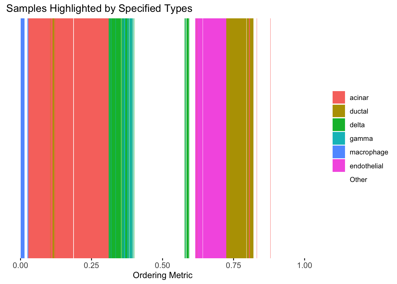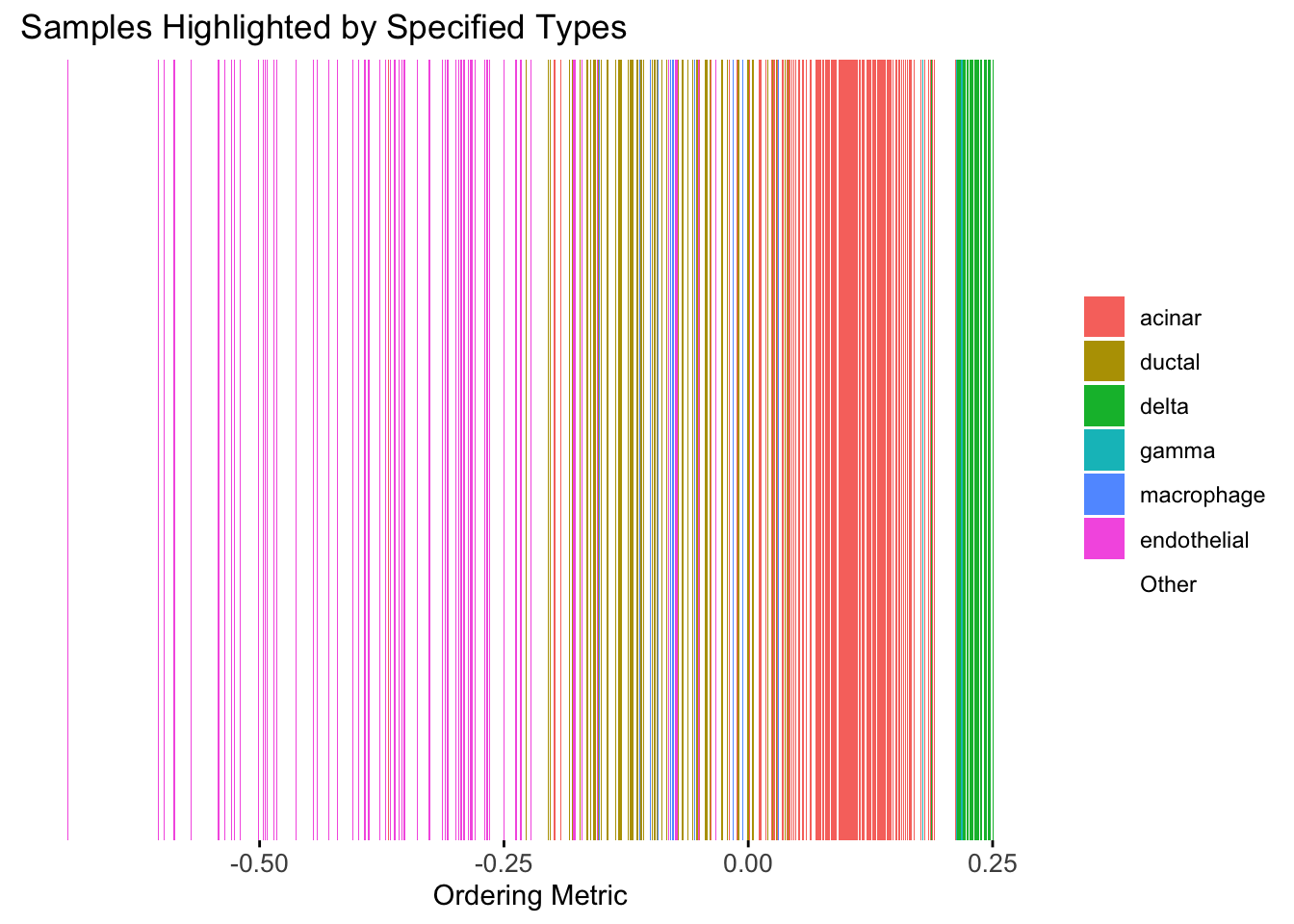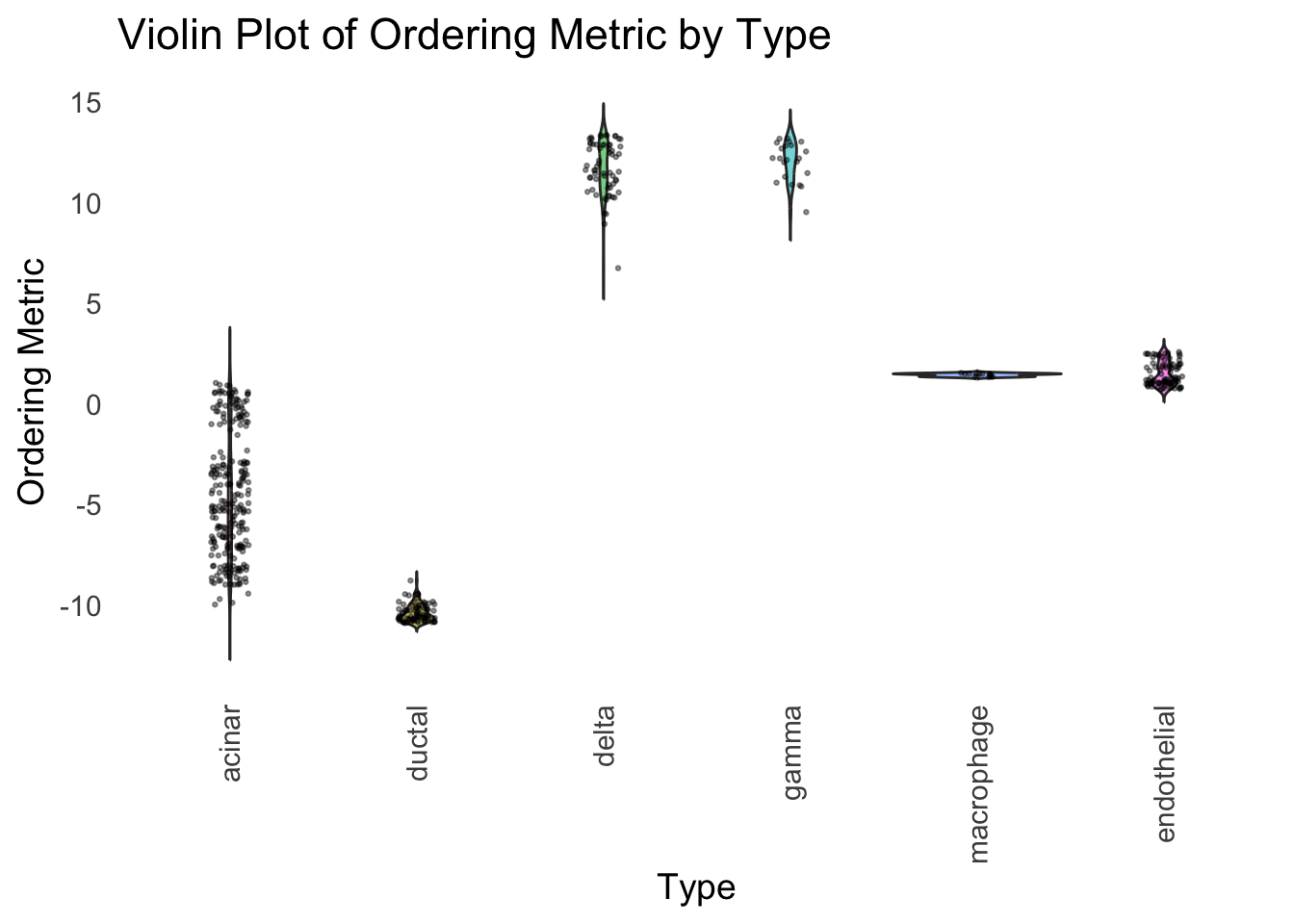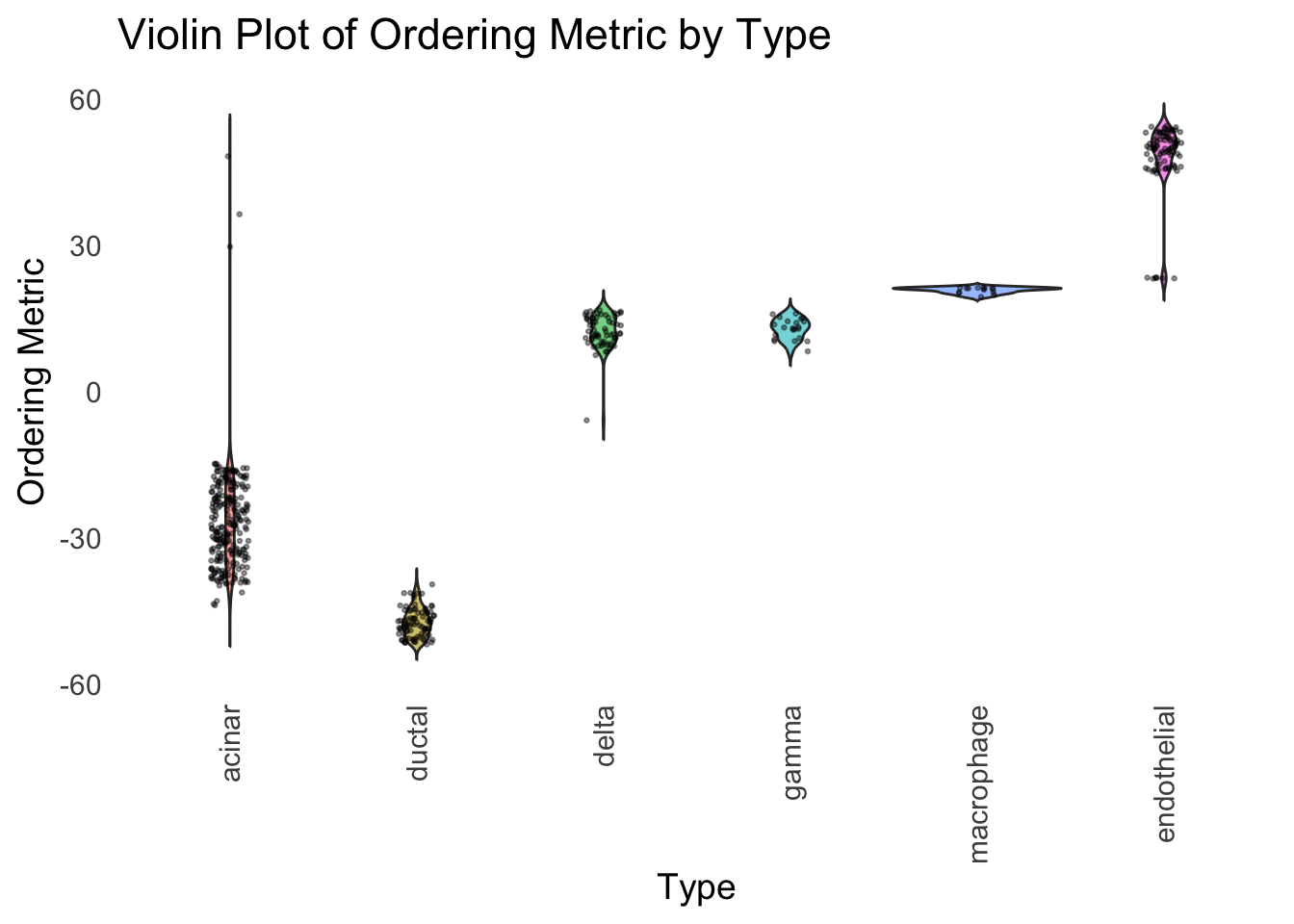 Here the x-axis represents the latent ordering of each cell, and the color represents its cell type. Based on this figure, it appears the first PC distinguishes between (delta, gamma) and (acinar, ductal). However, the ordering could not tell the difference between delta and gamma. Also, the ordering could not distinguish the macrophage from other cell types.