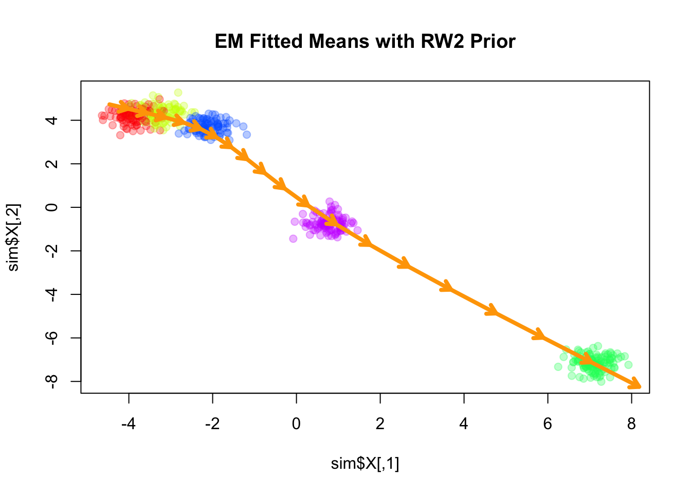 pch=19, main="EM Fitted Means with RW2 Prior")