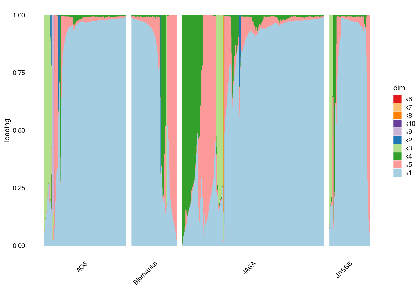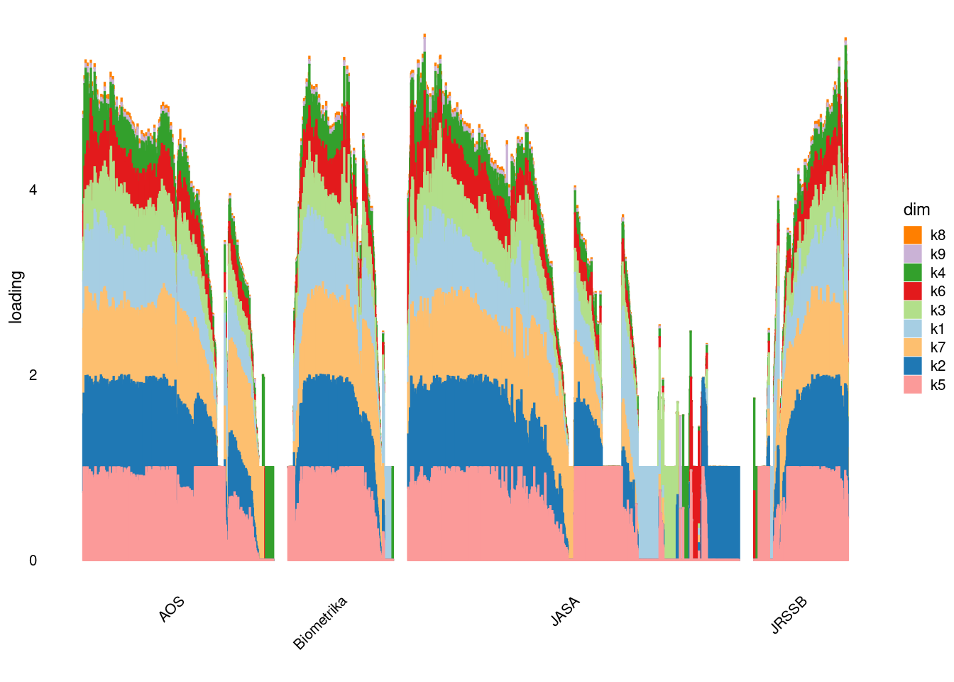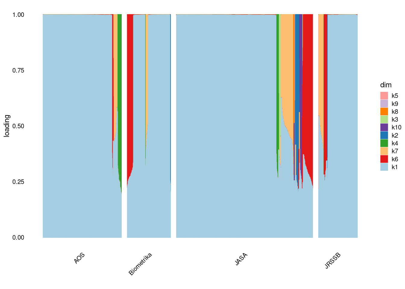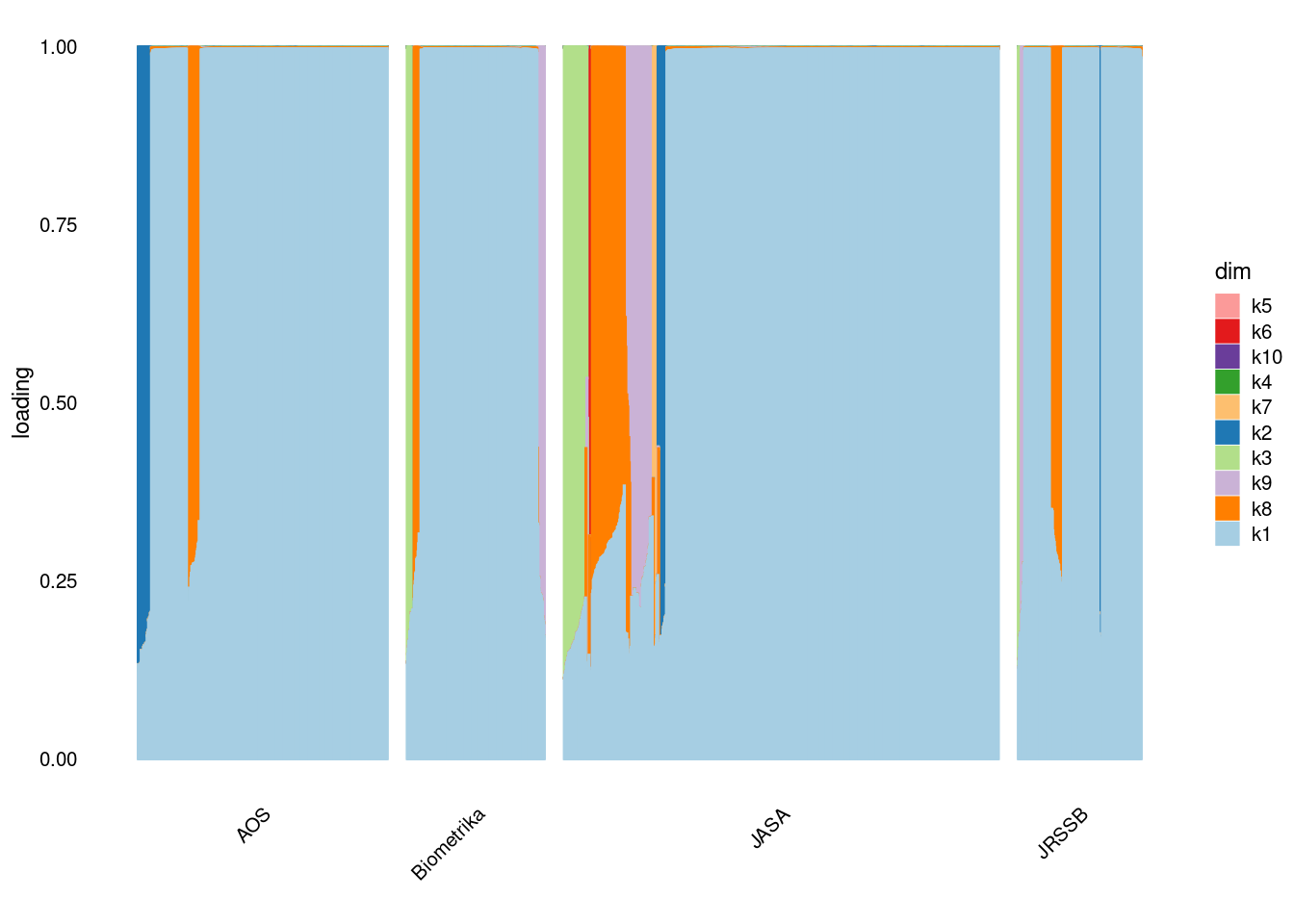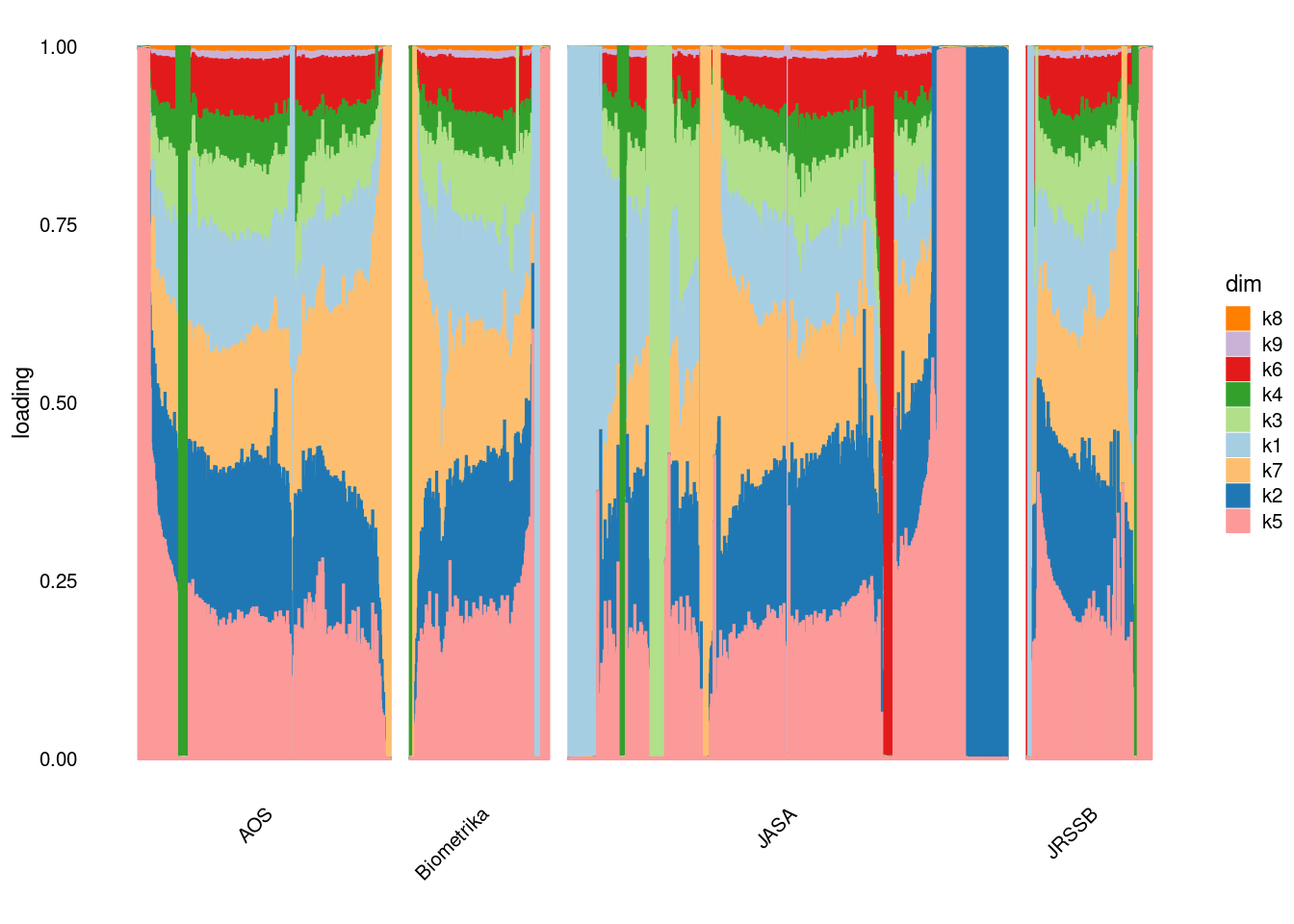p4=structure_plot_general(fit_ebpmf3$fit_flash$L_pm[,-c(1,2)],fit_flash$F_pm,grouping = samples$journal,std_L_method = 'col_max_1')