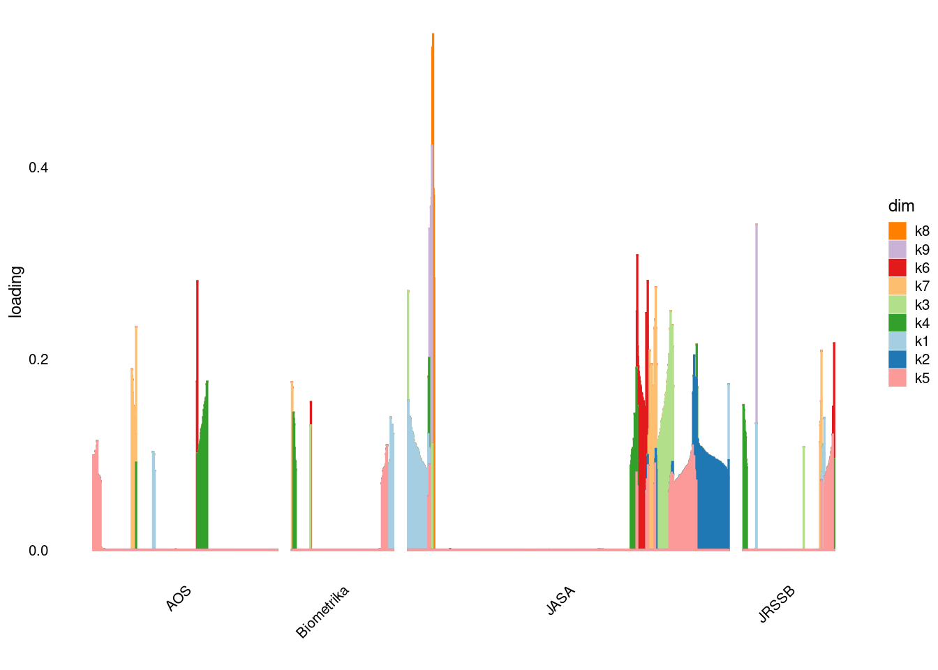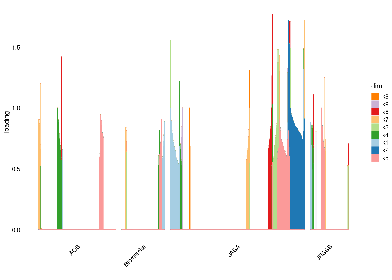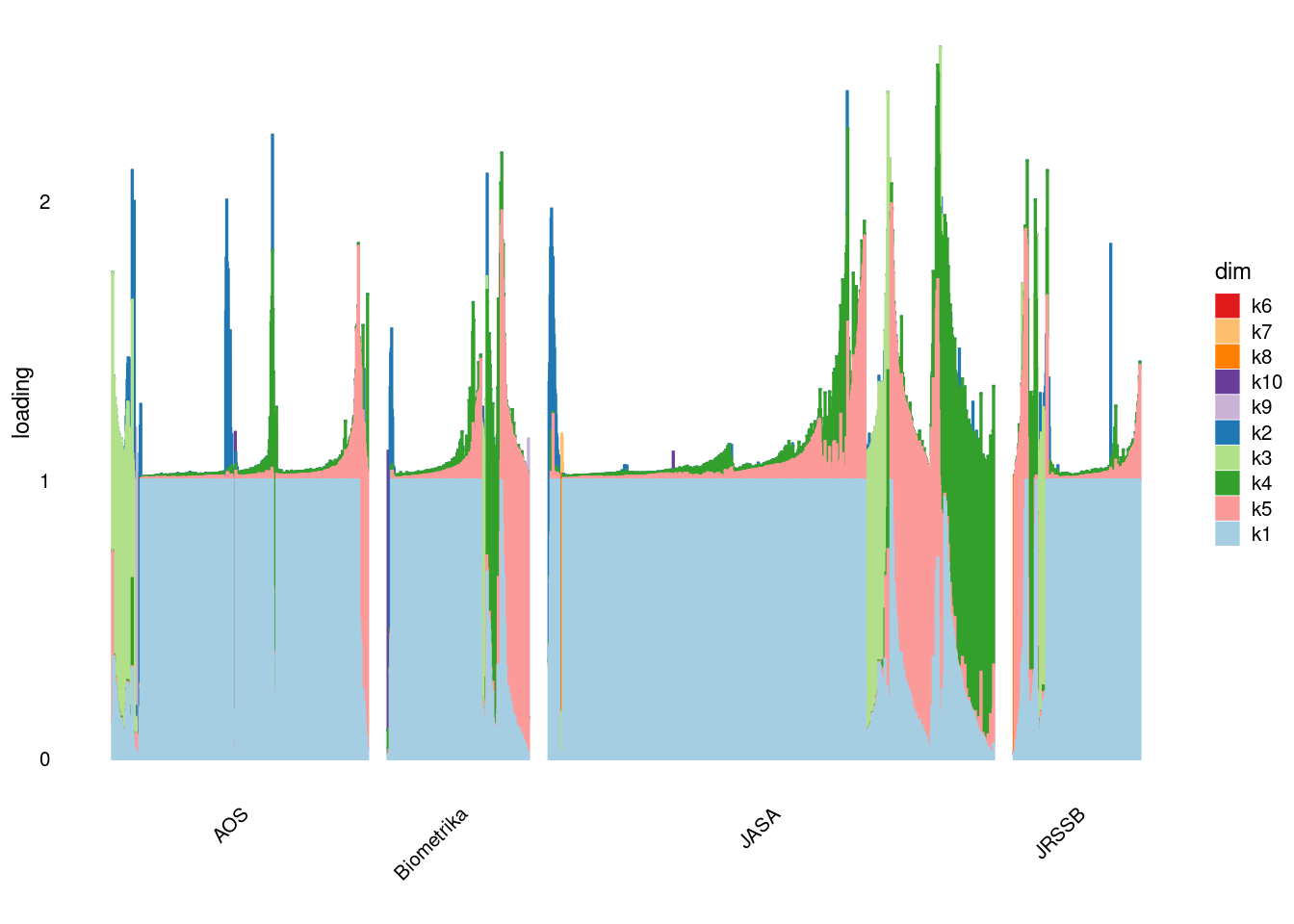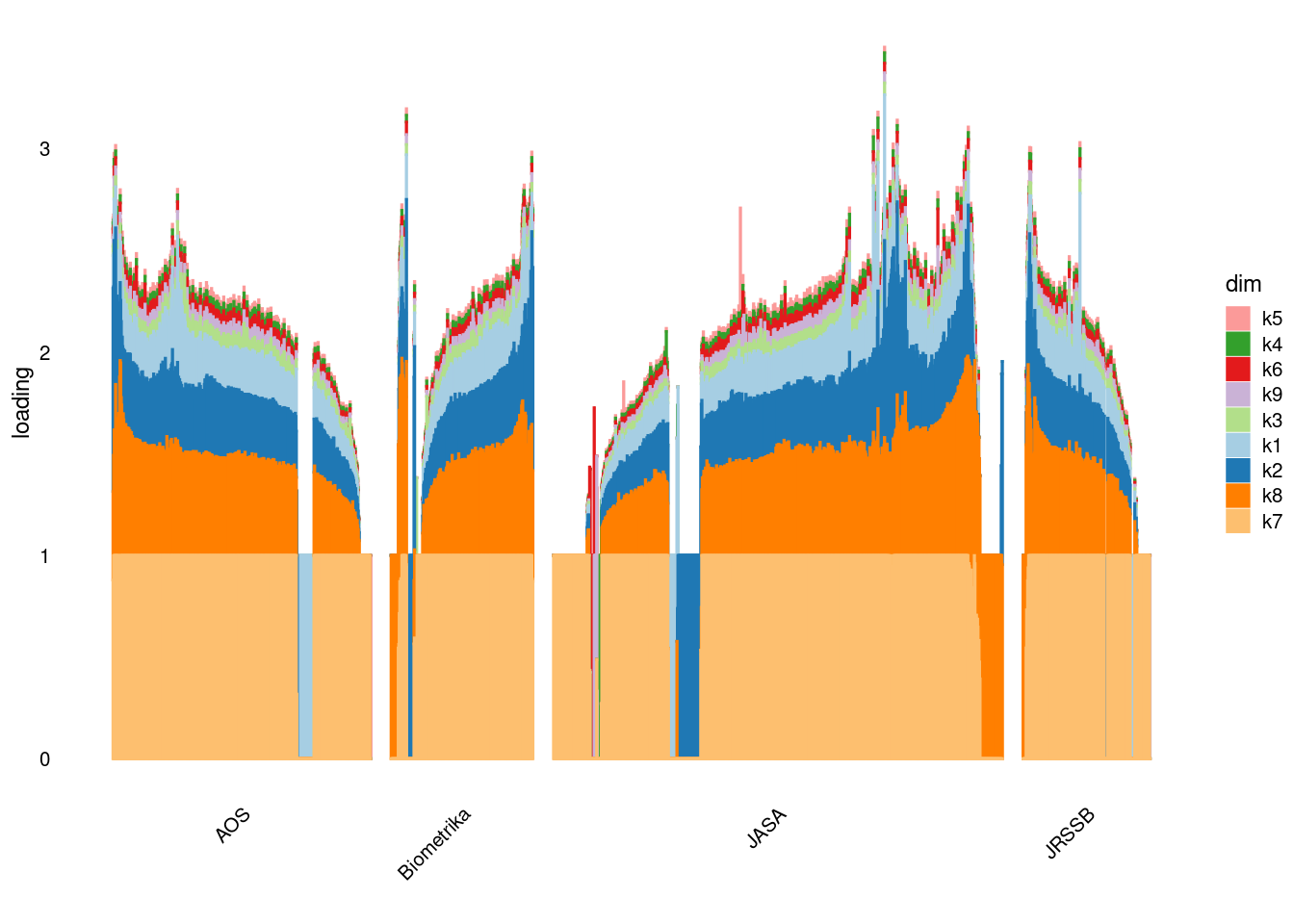 p4=structure_plot_general(fit_ebpmf3$fit_flash$L_pm[,-c(1,2)],fit_flash$F_pm,grouping = samples$journal,std_L_method = 'col_max_1')