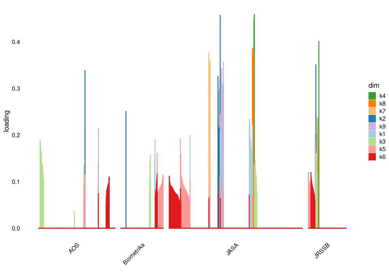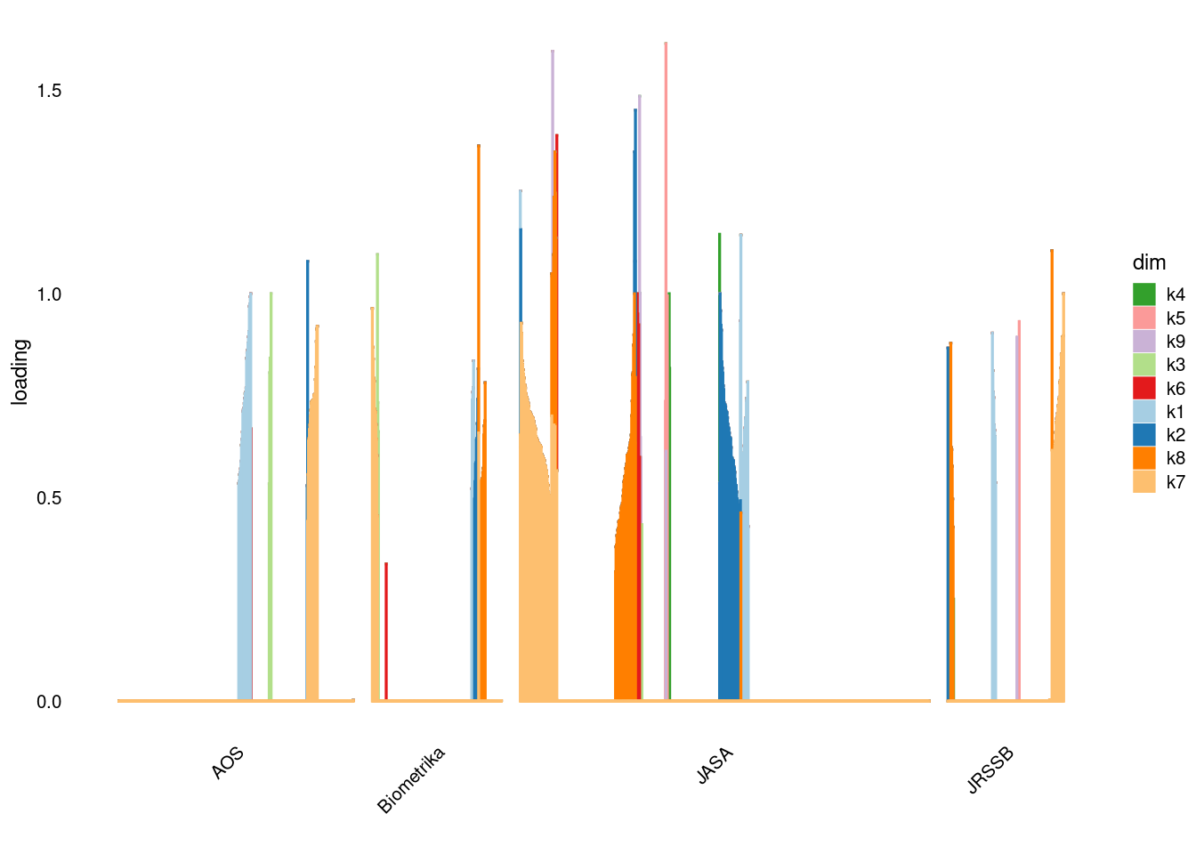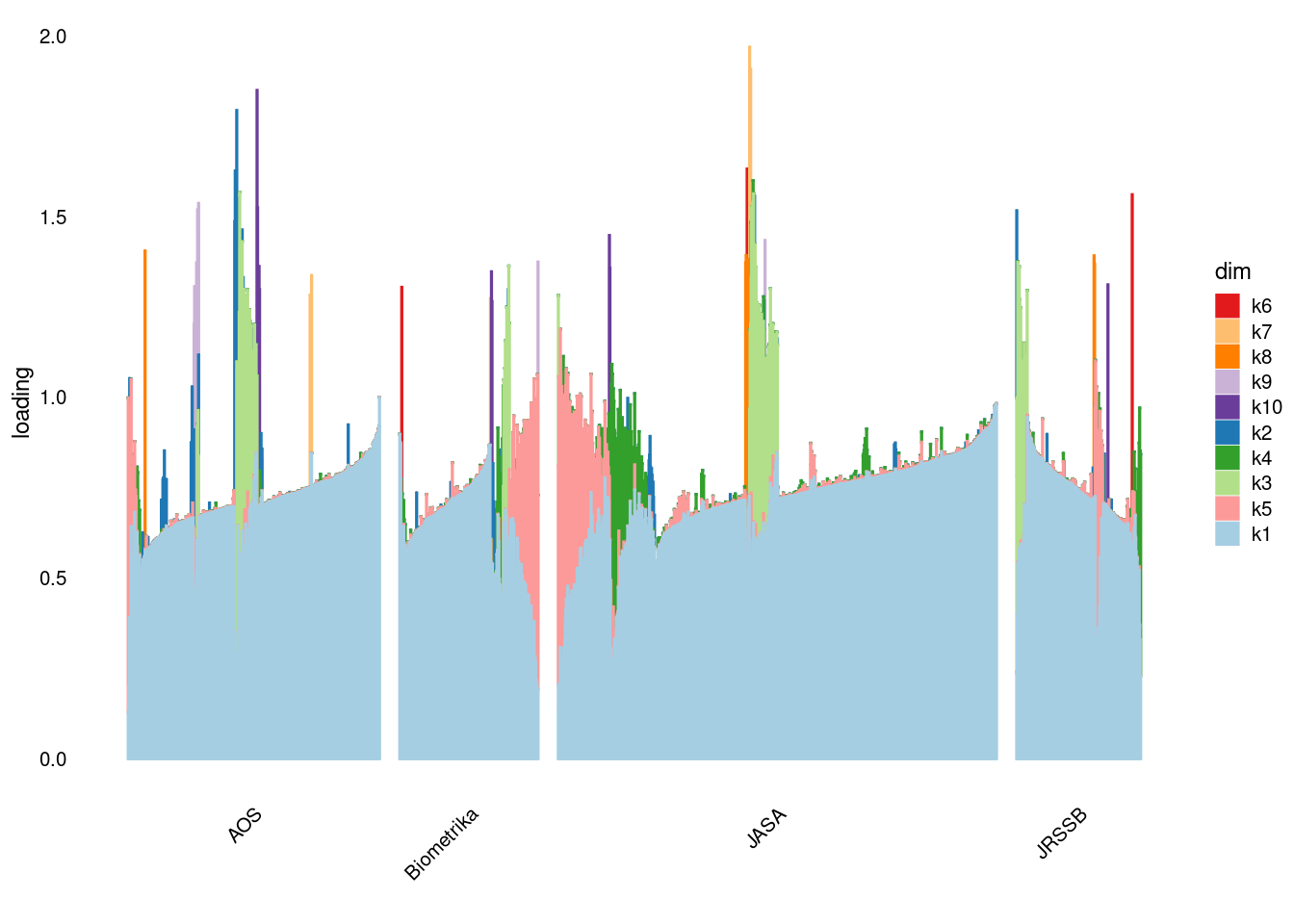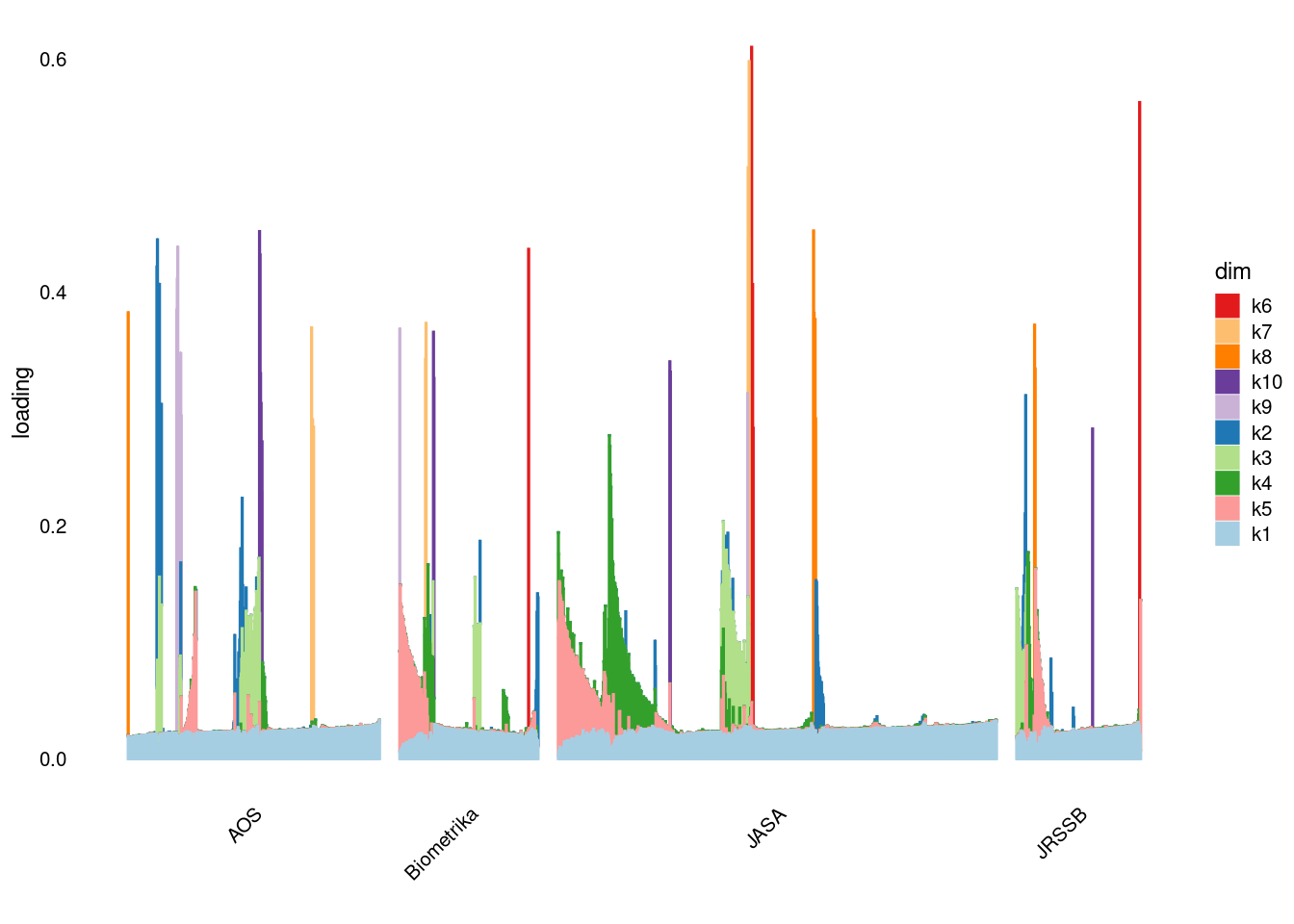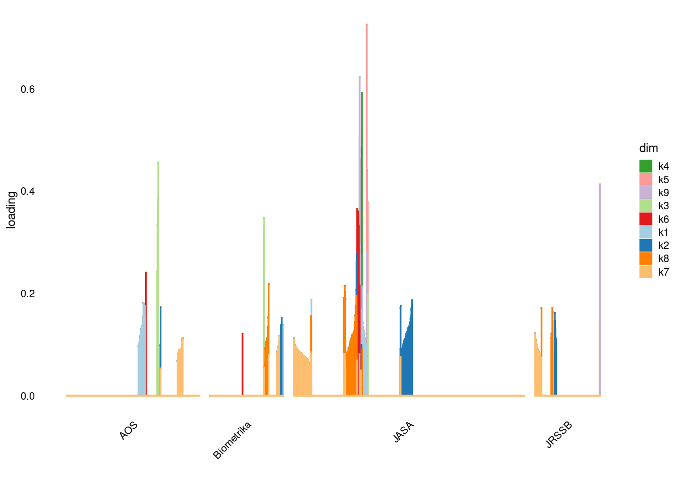 p4=structure_plot_general(fit_ebpmf3$fit_flash$L_pm[,-c(1,2)],fit_flash$F_pm,grouping = samples$journal,std_L_method = 'col_max_1')