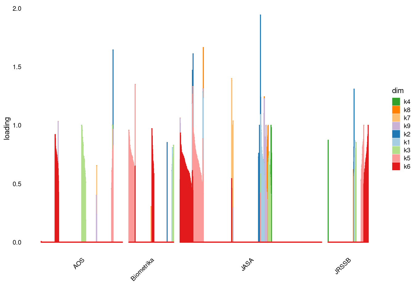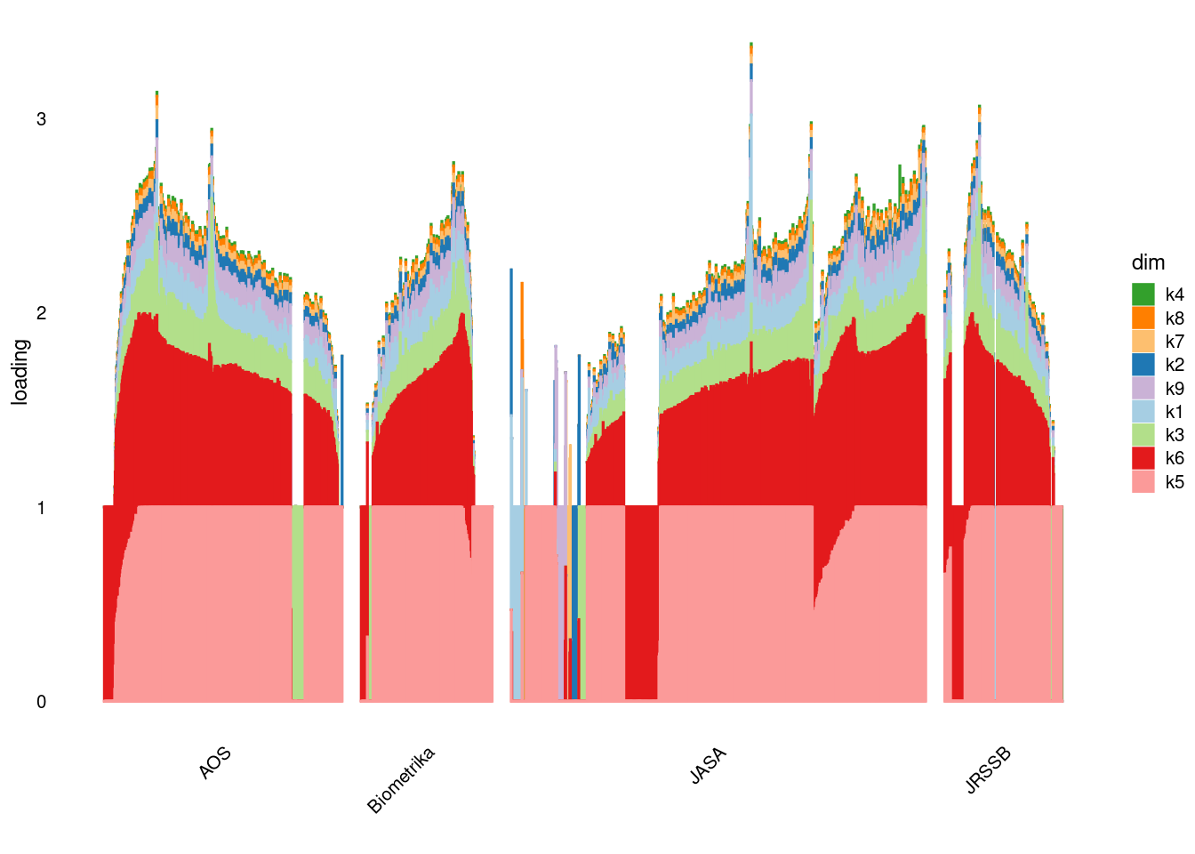 p2=structure_plot_general(fit_ebpmf3$fit_flash$L_pm[,-c(1,2)],fit_flash$F_pm,grouping = samples$journal,std_L_method = 'row_max_1')