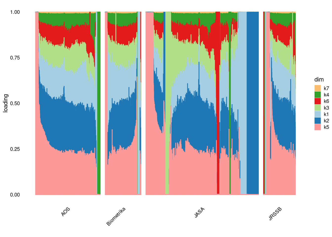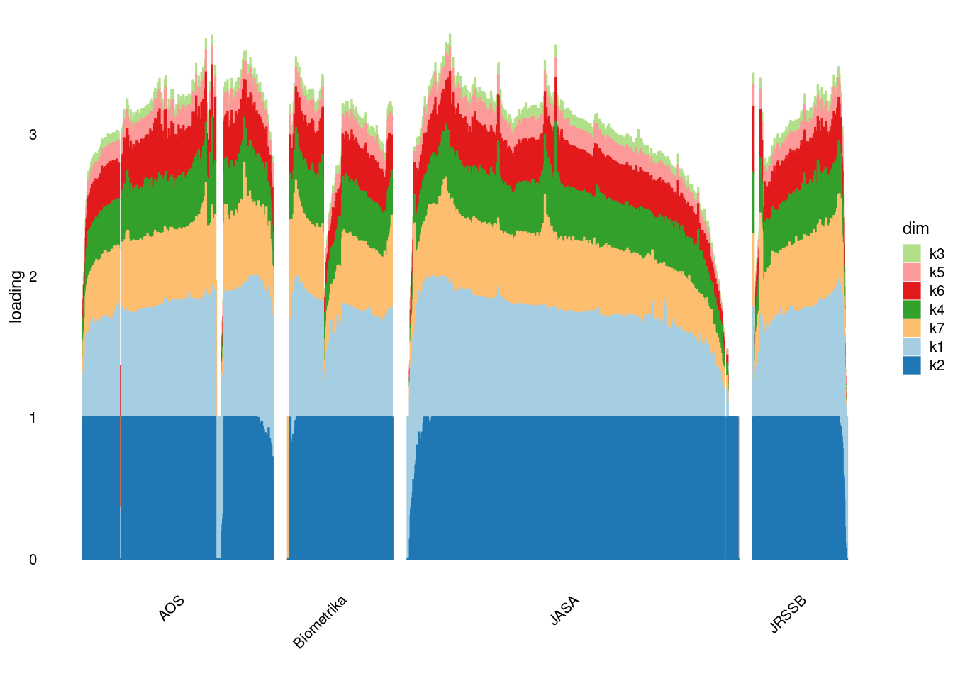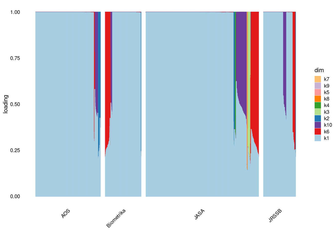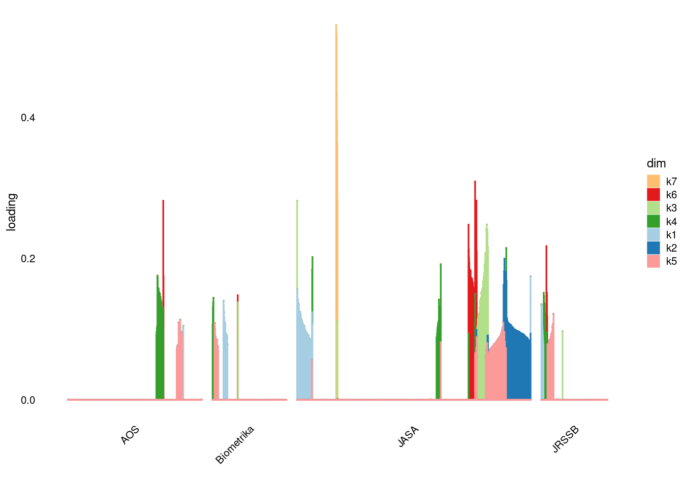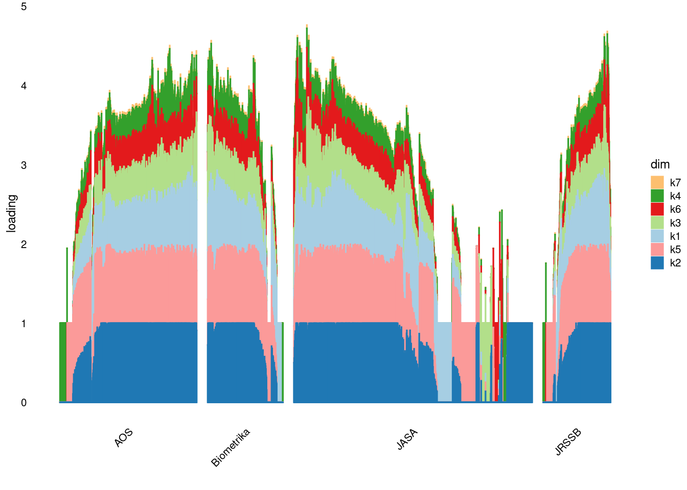 p4=structure_plot_general(fit_ebpmf3$fit_flash$L_pm[,-c(1,2)],fit_flash$F_pm,grouping = samples$journal,std_L_method = 'col_max_1')