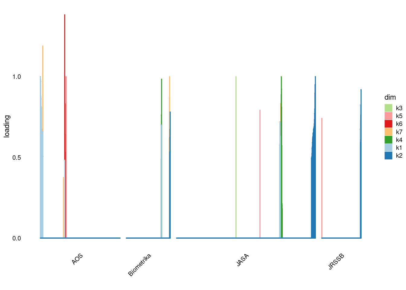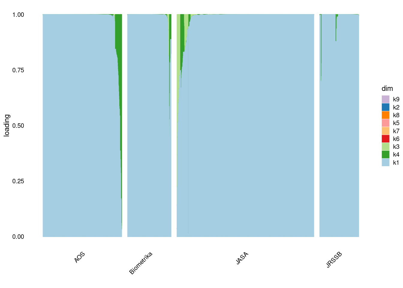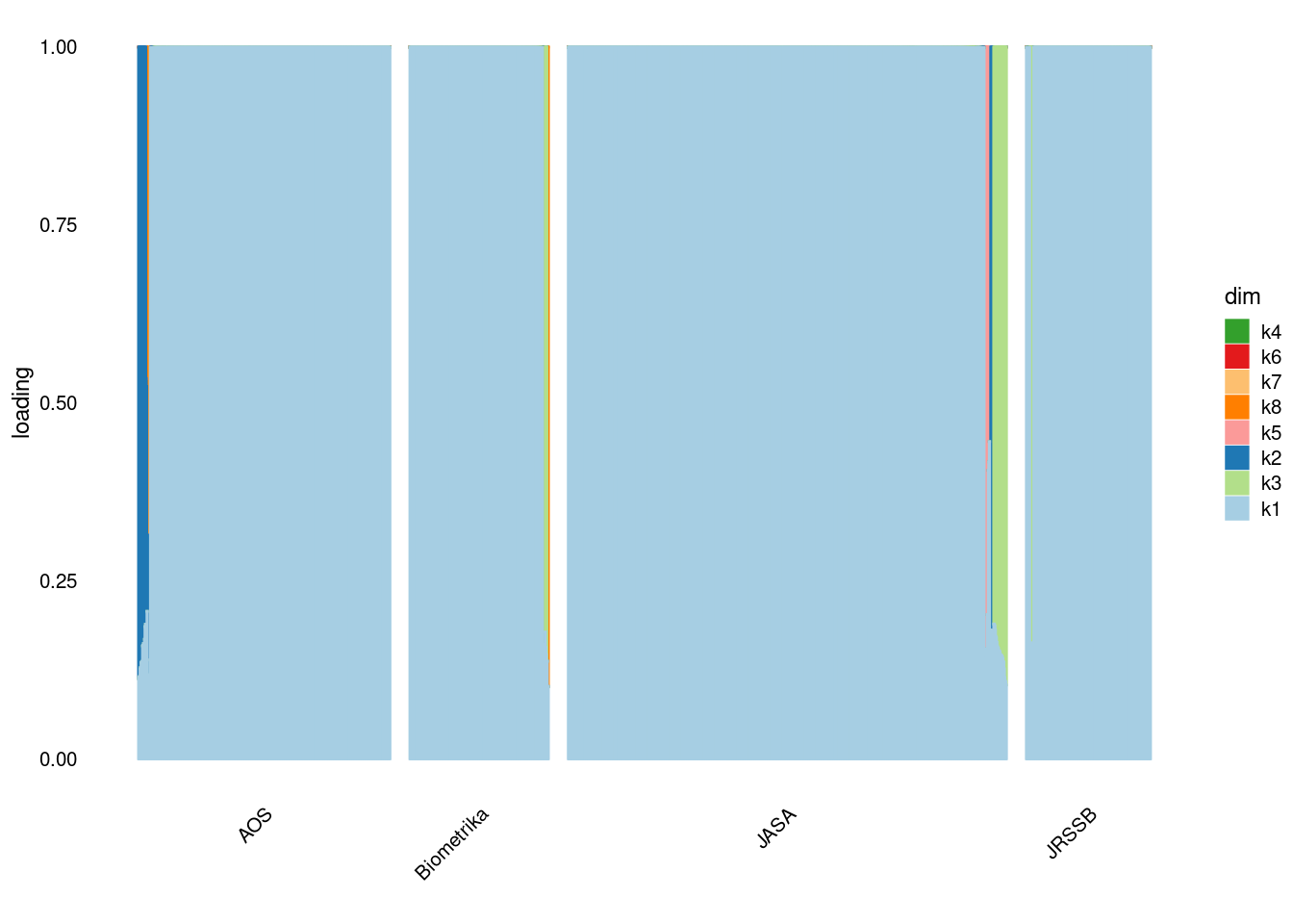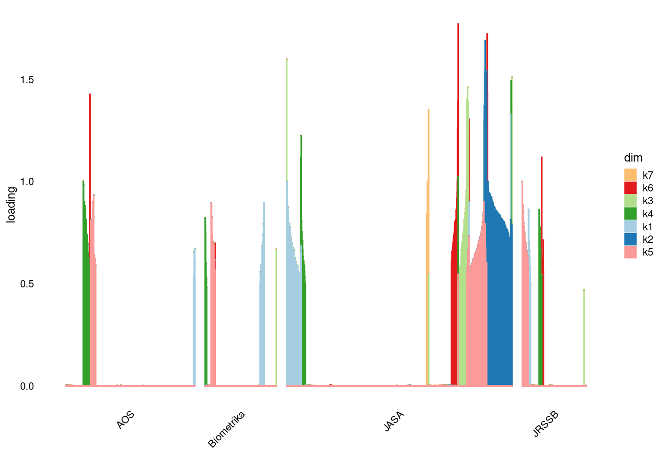 p4=structure_plot_general(fit_ebpmf3$fit_flash$L_pm[,-c(1,2)],fit_flash$F_pm,grouping = samples$journal,std_L_method = 'col_max_1')