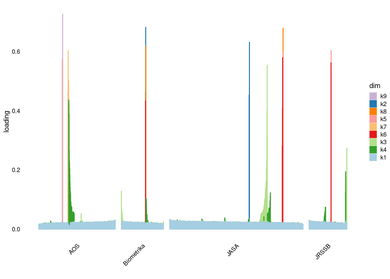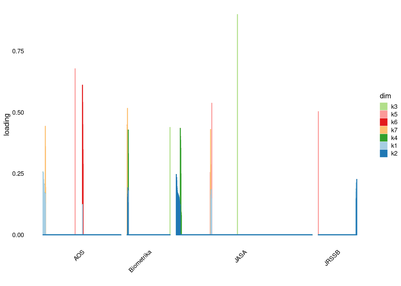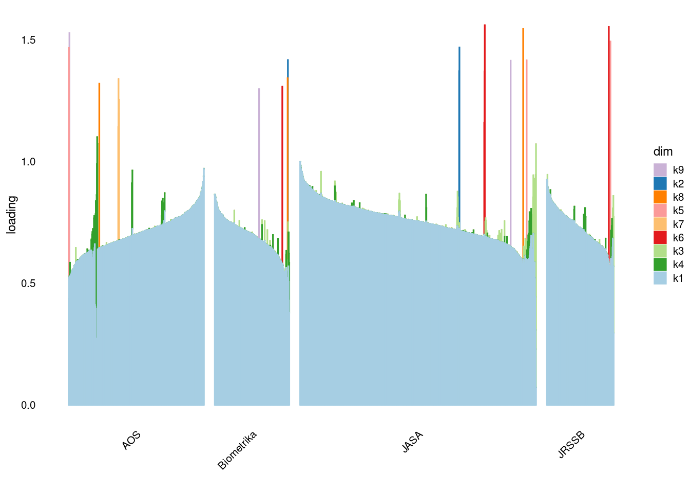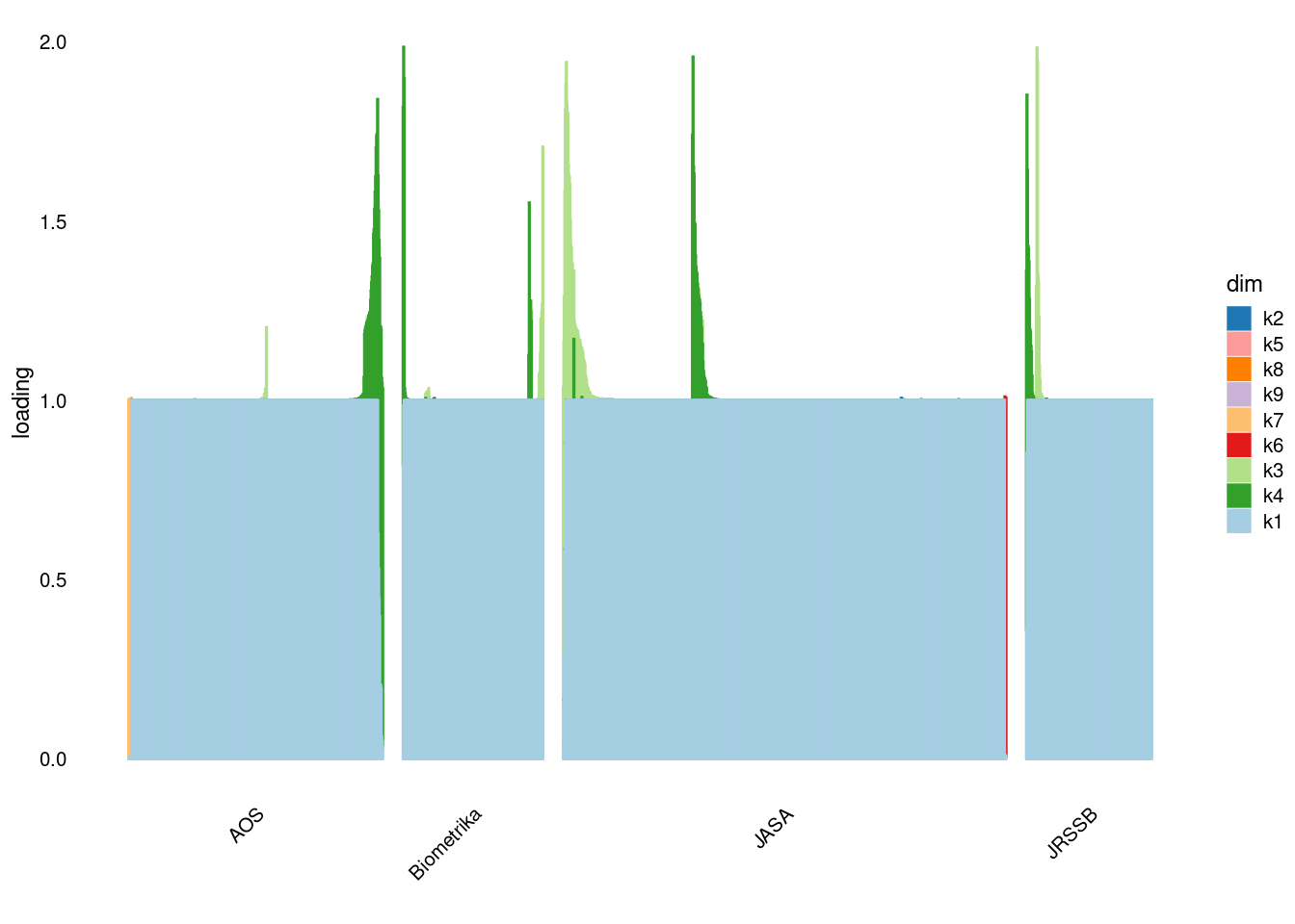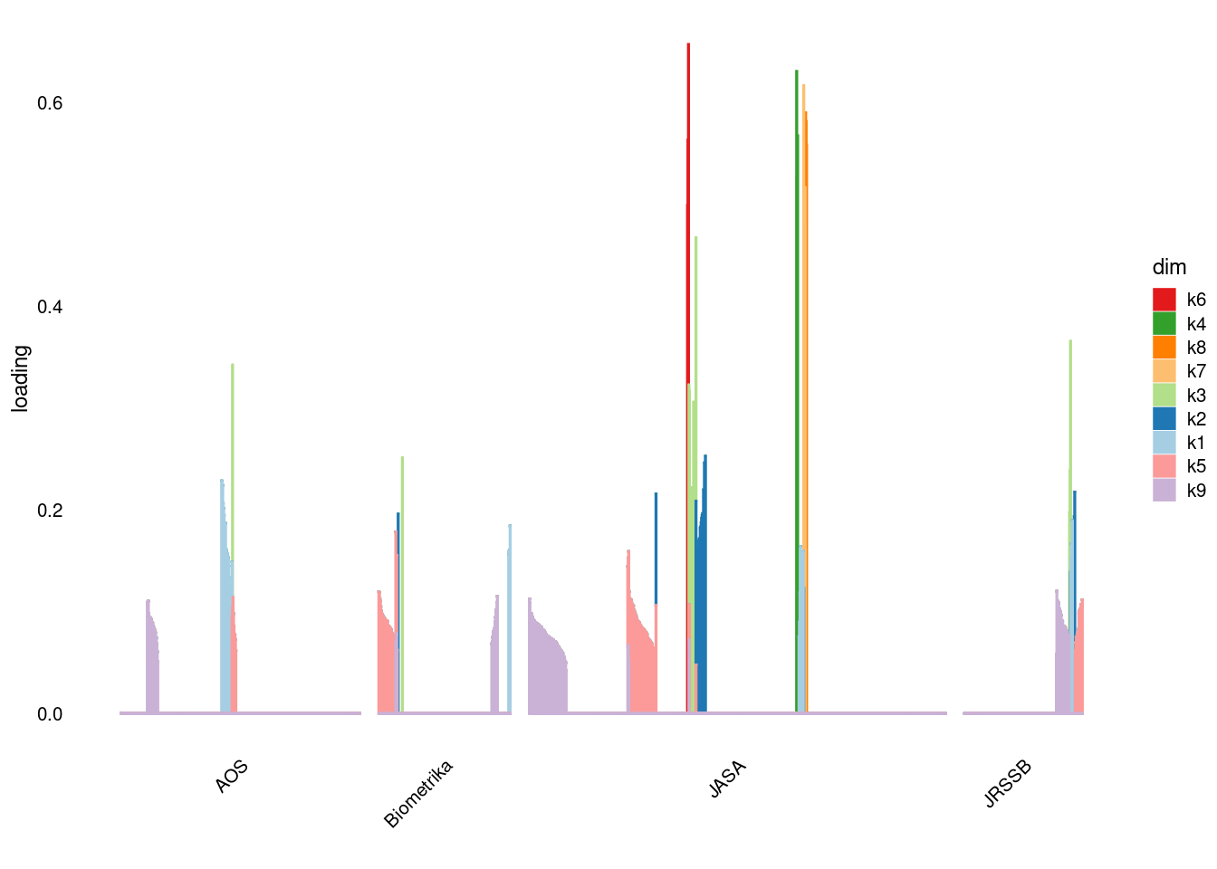 p4=structure_plot_general(fit_ebpmf3$fit_flash$L_pm[,-c(1,2)],fit_flash$F_pm,grouping = samples$journal,std_L_method = 'col_max_1')