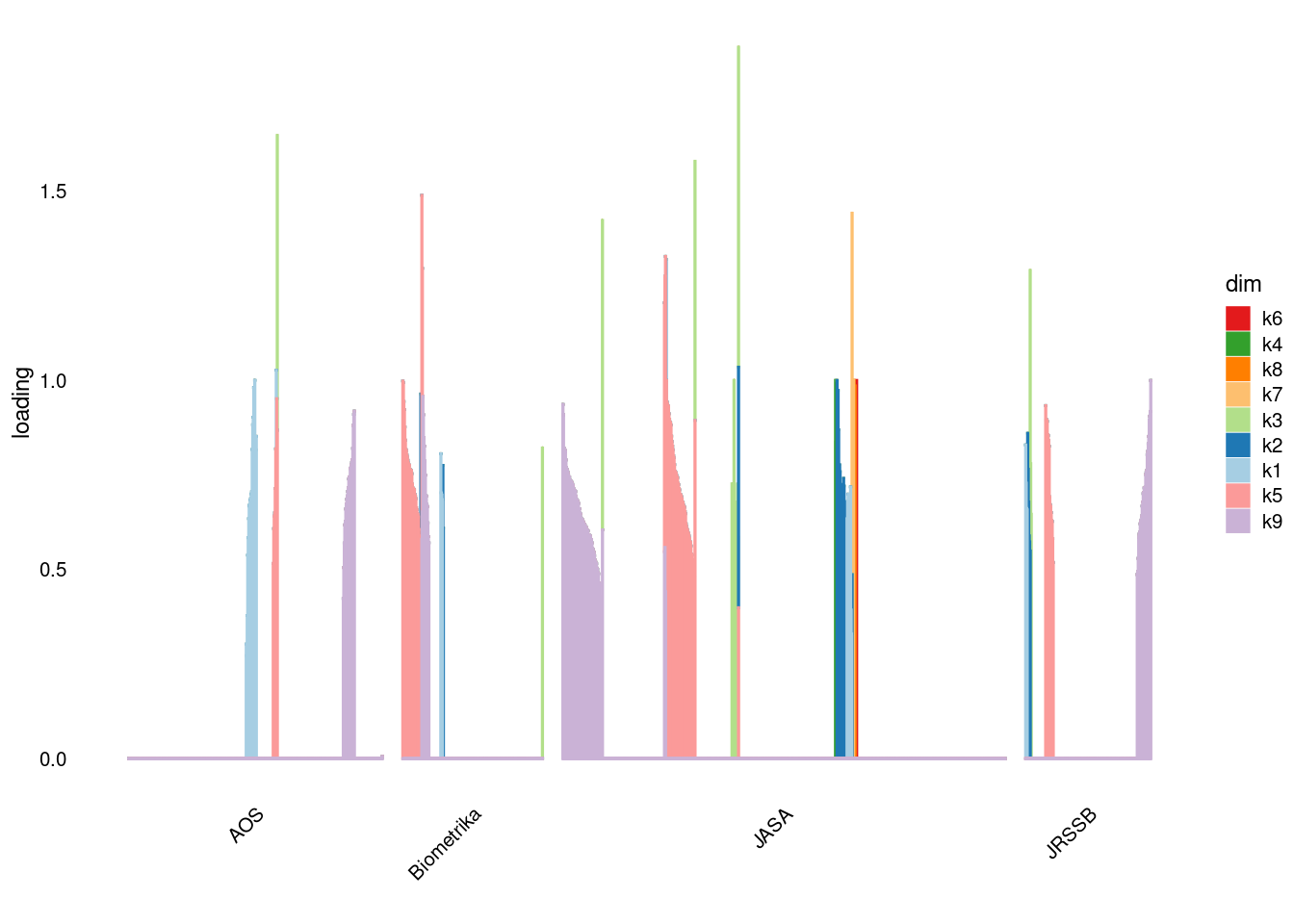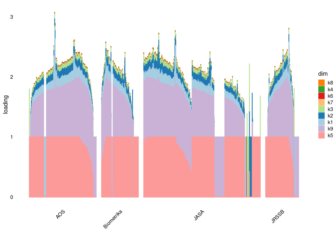p2=structure_plot_general(fit_ebpmf3$fit_flash$L_pm[,-c(1,2)],fit_flash$F_pm,grouping = samples$journal,std_L_method = 'row_max_1')