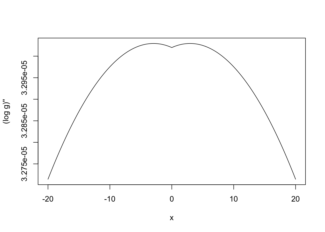 plot(xx,c(y_n,y_p),type='l',ylab="(log g)''",xlab='x')