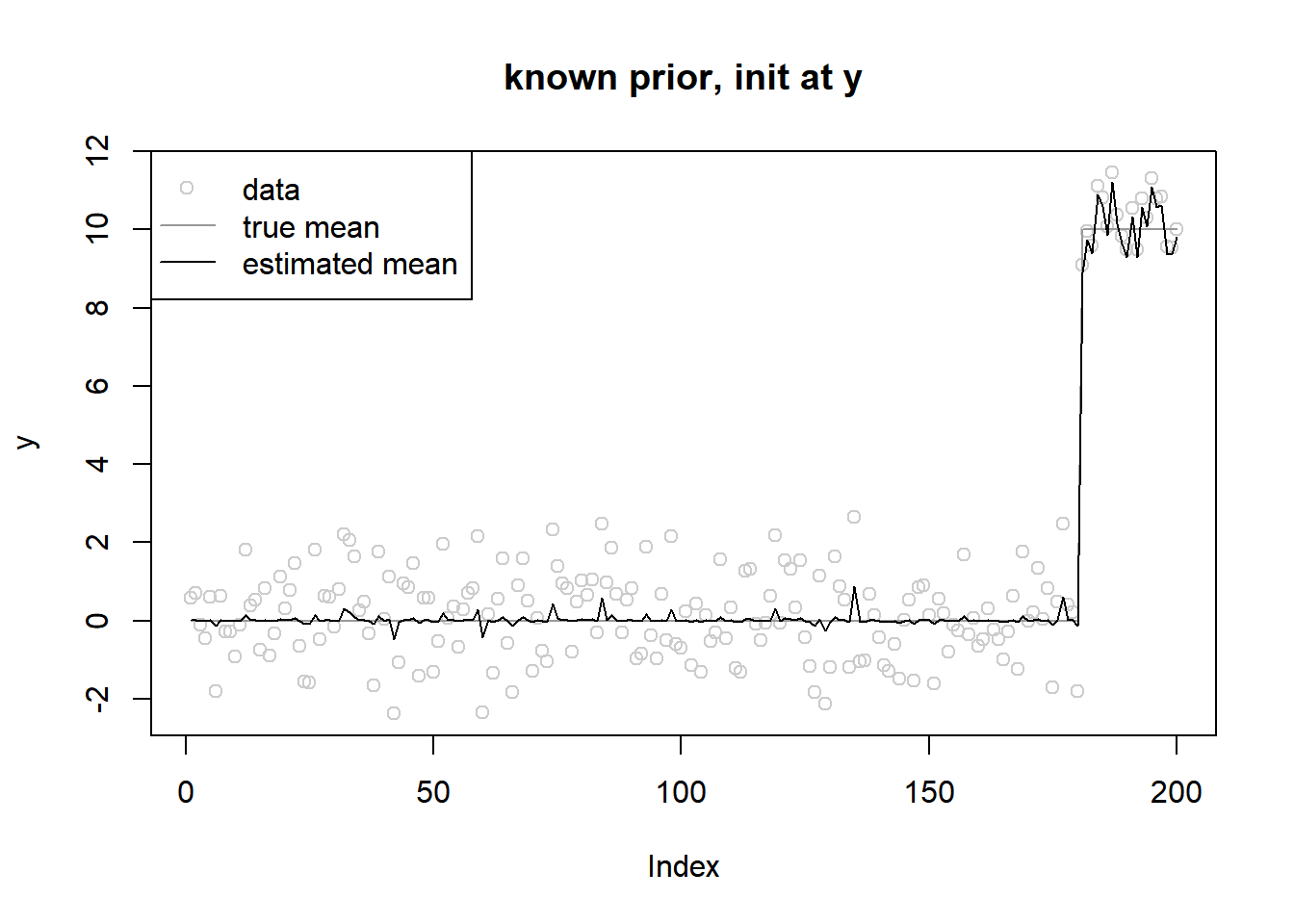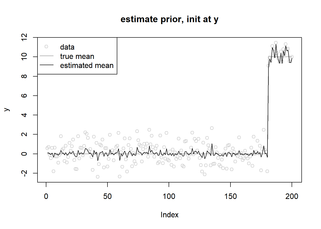 ploter(fit,y,mu,main='estimate prior, init at y')