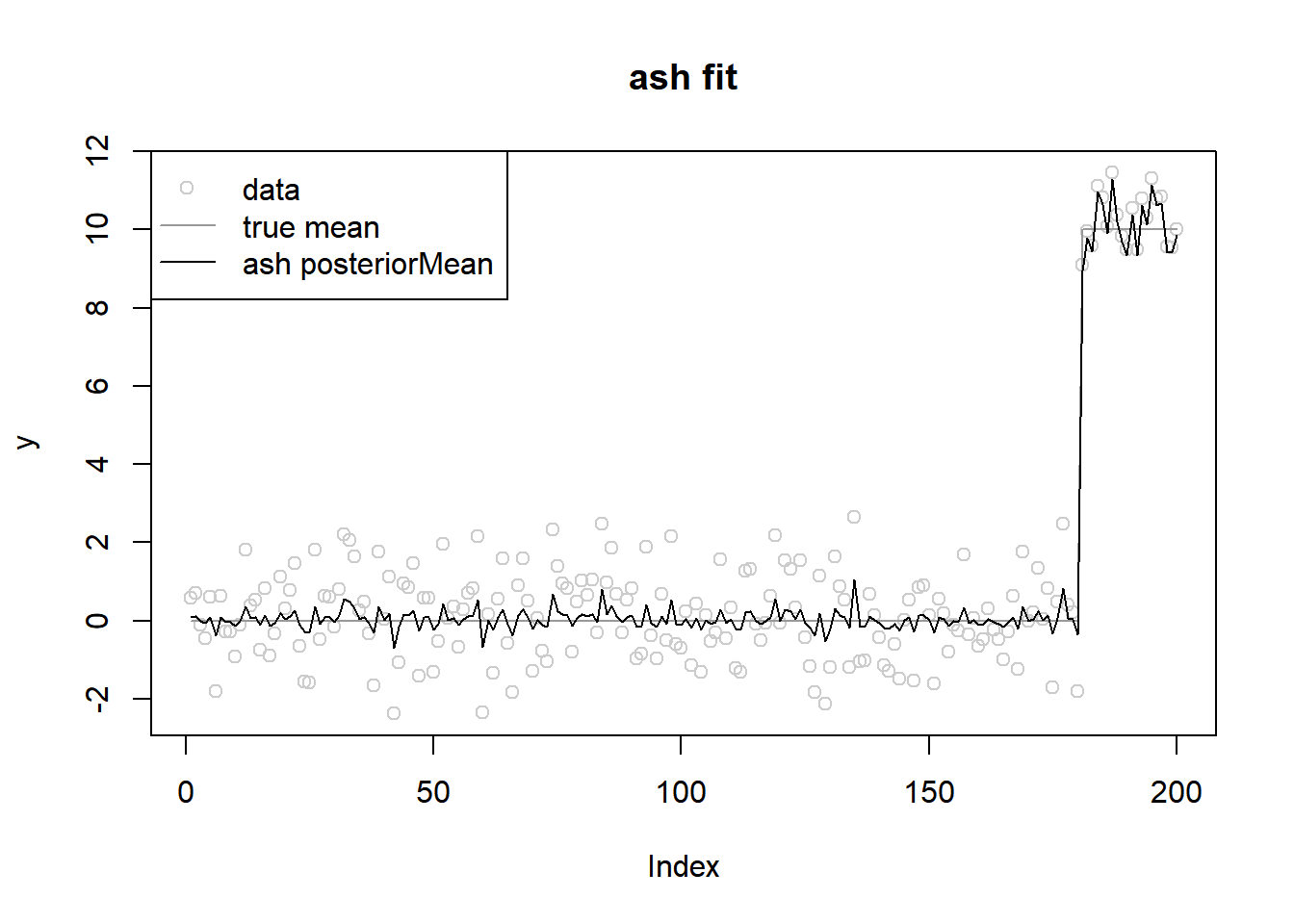 #legend('topleft',c('data','true mean','ash posteriorMean'),pch=c(1,NA,NA),lty=c(NA,1,1),col=c('grey80','grey60',1))