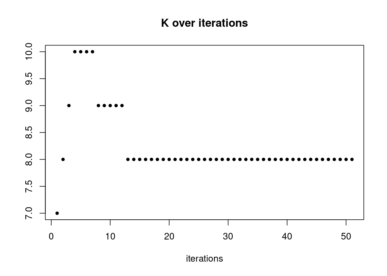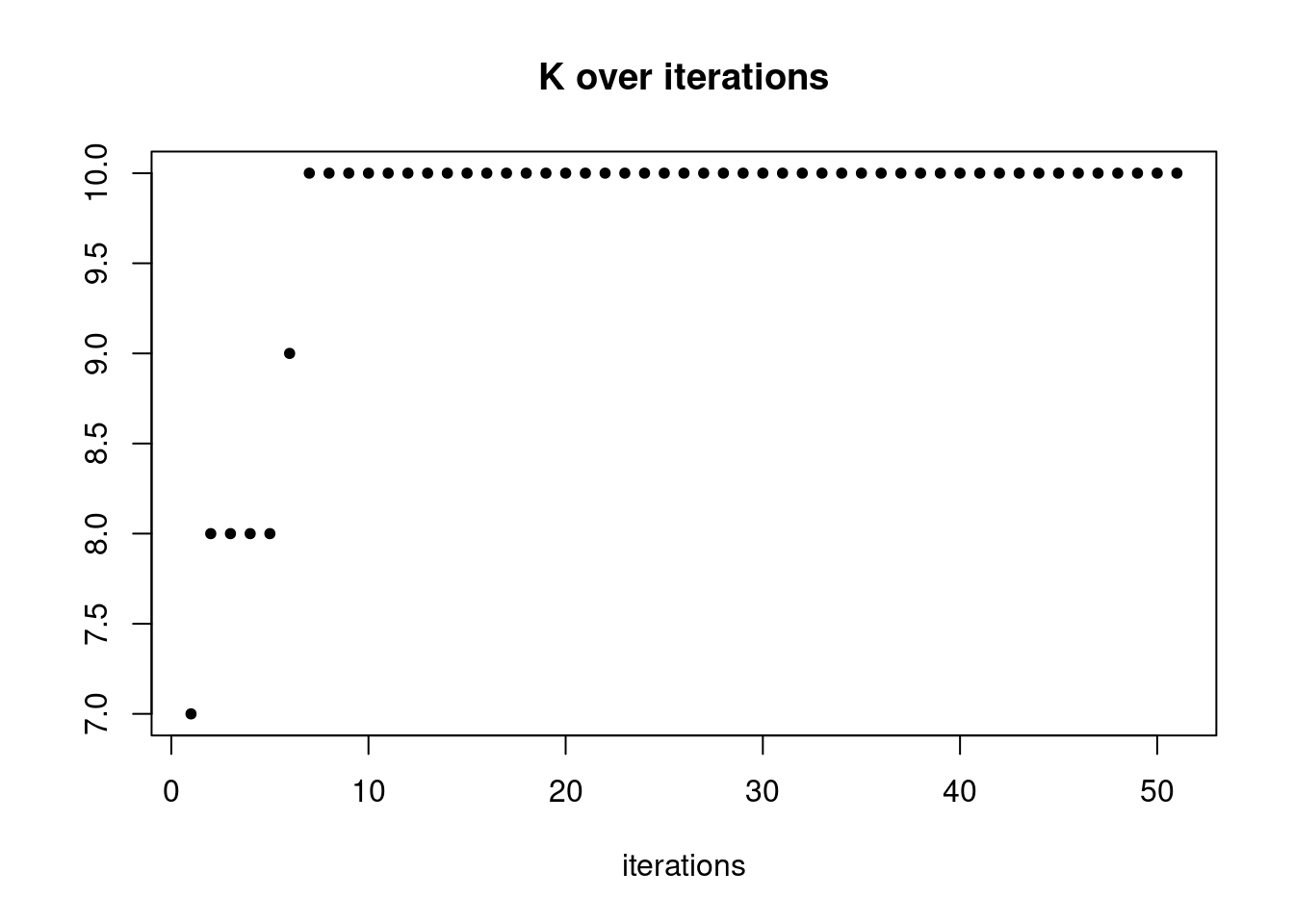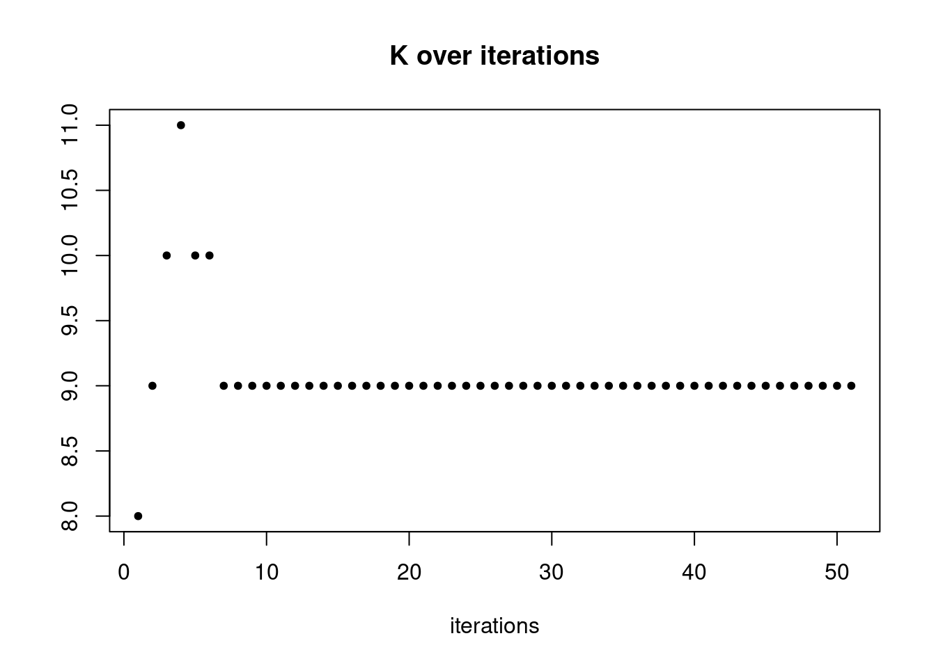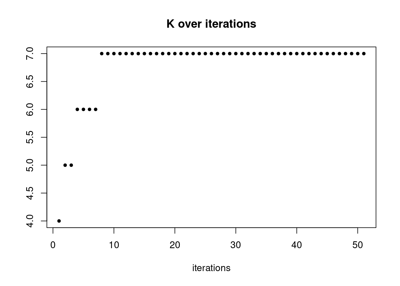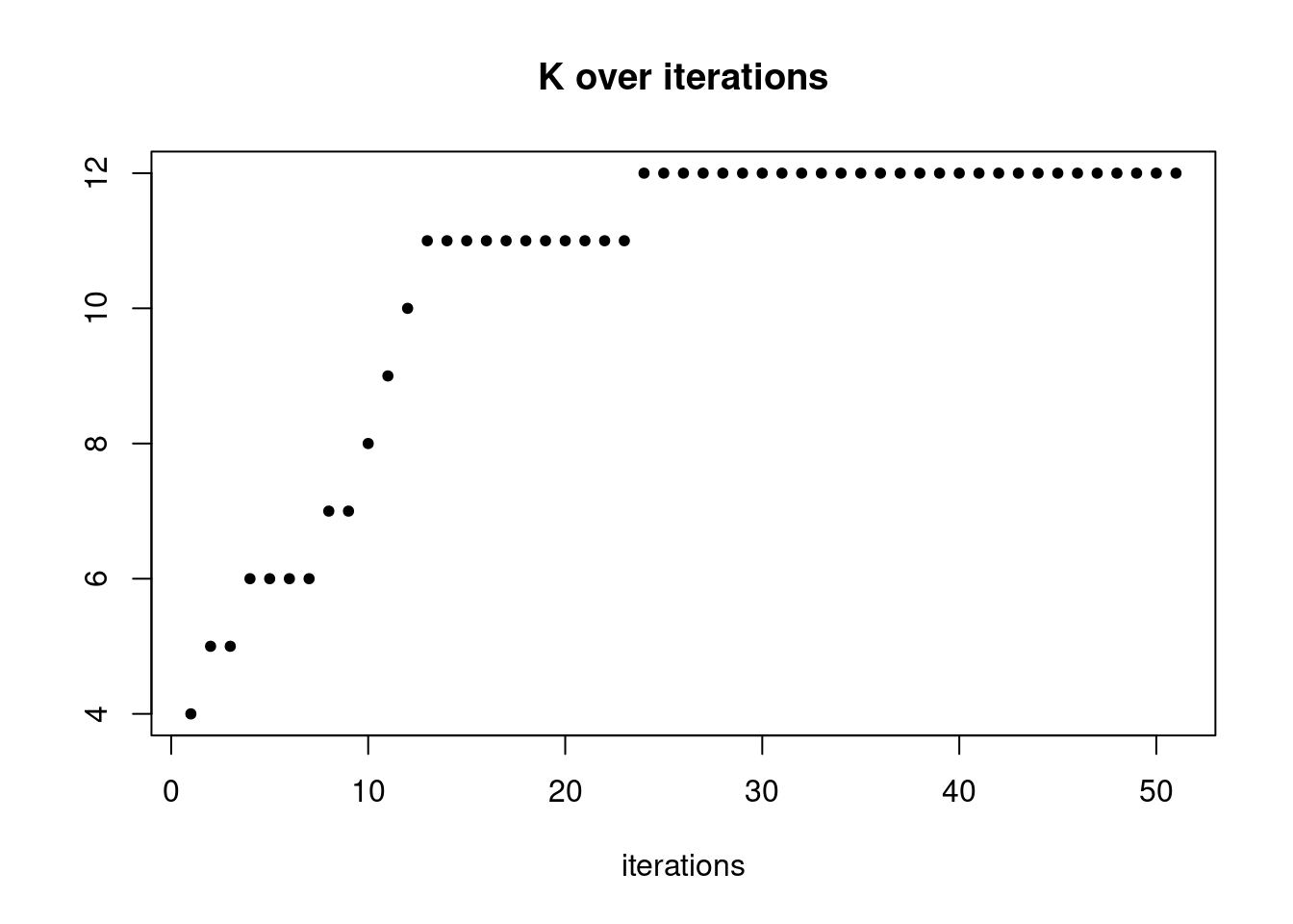 plot(res$K_trace,ylab='',xlab='iterations',main='K over iterations',pch=20)