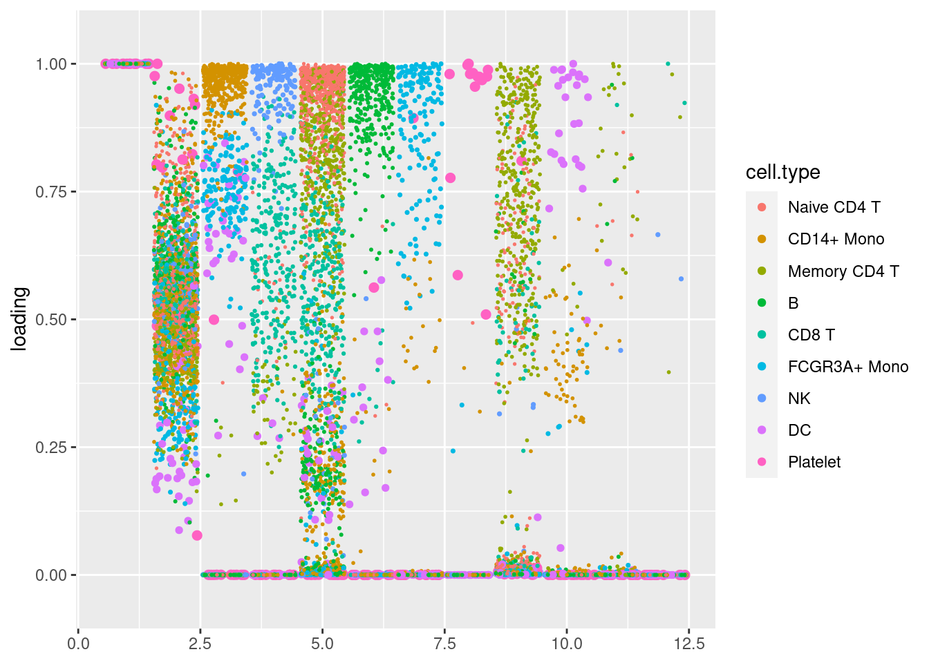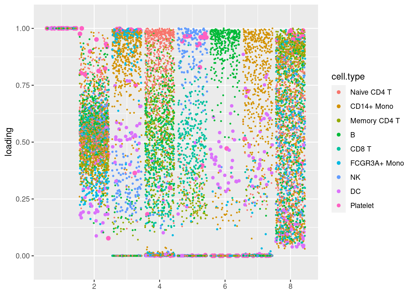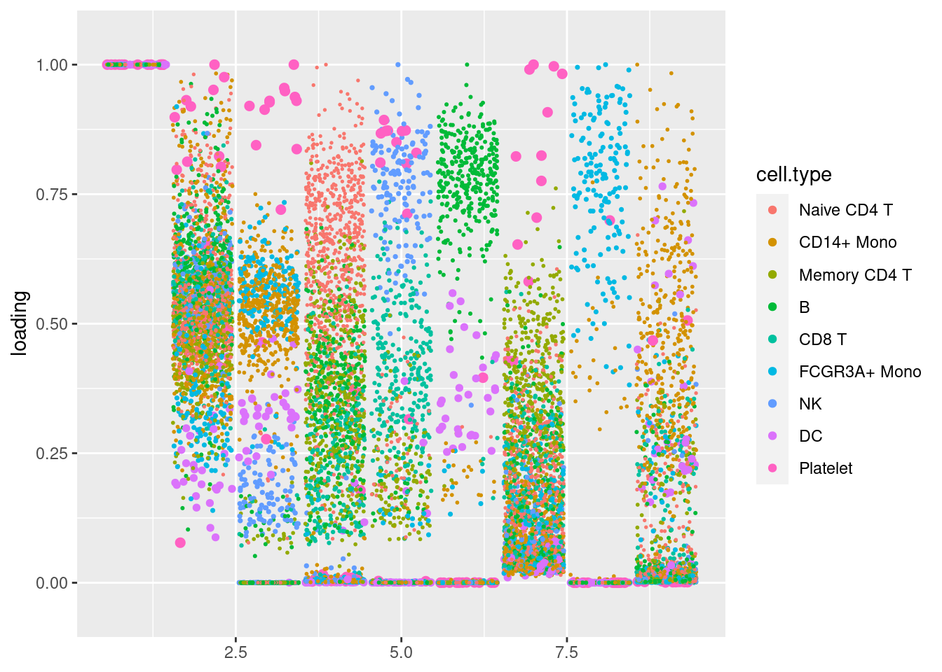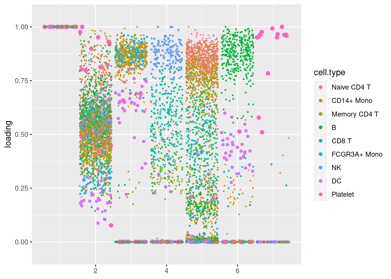 plot.factors(pbmc3k_nonnegLF_pe$fit_flash,pbmc3k$cell_type,nonnegative = T)