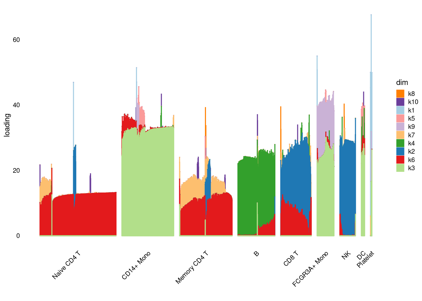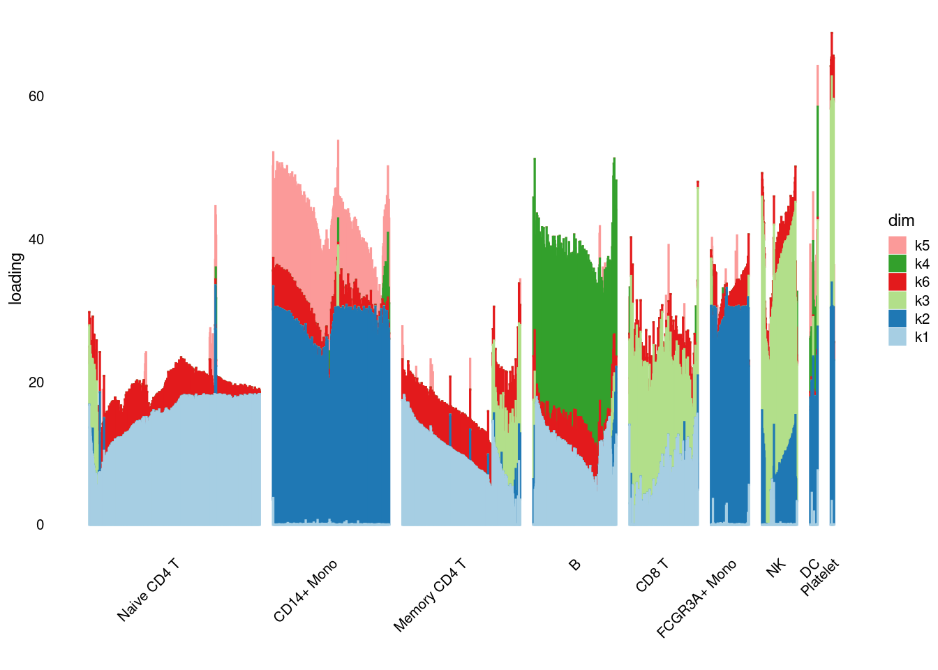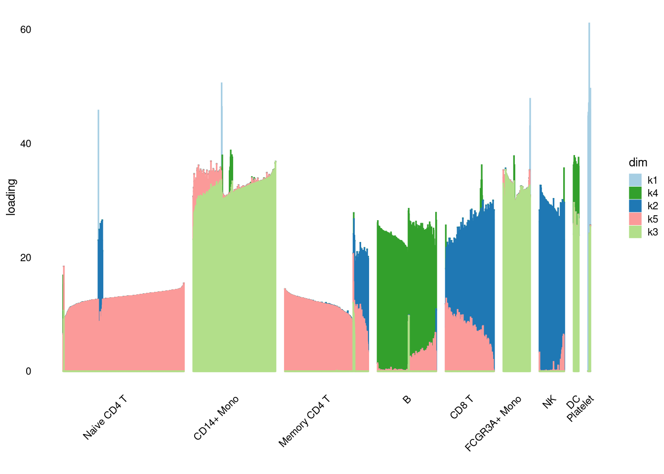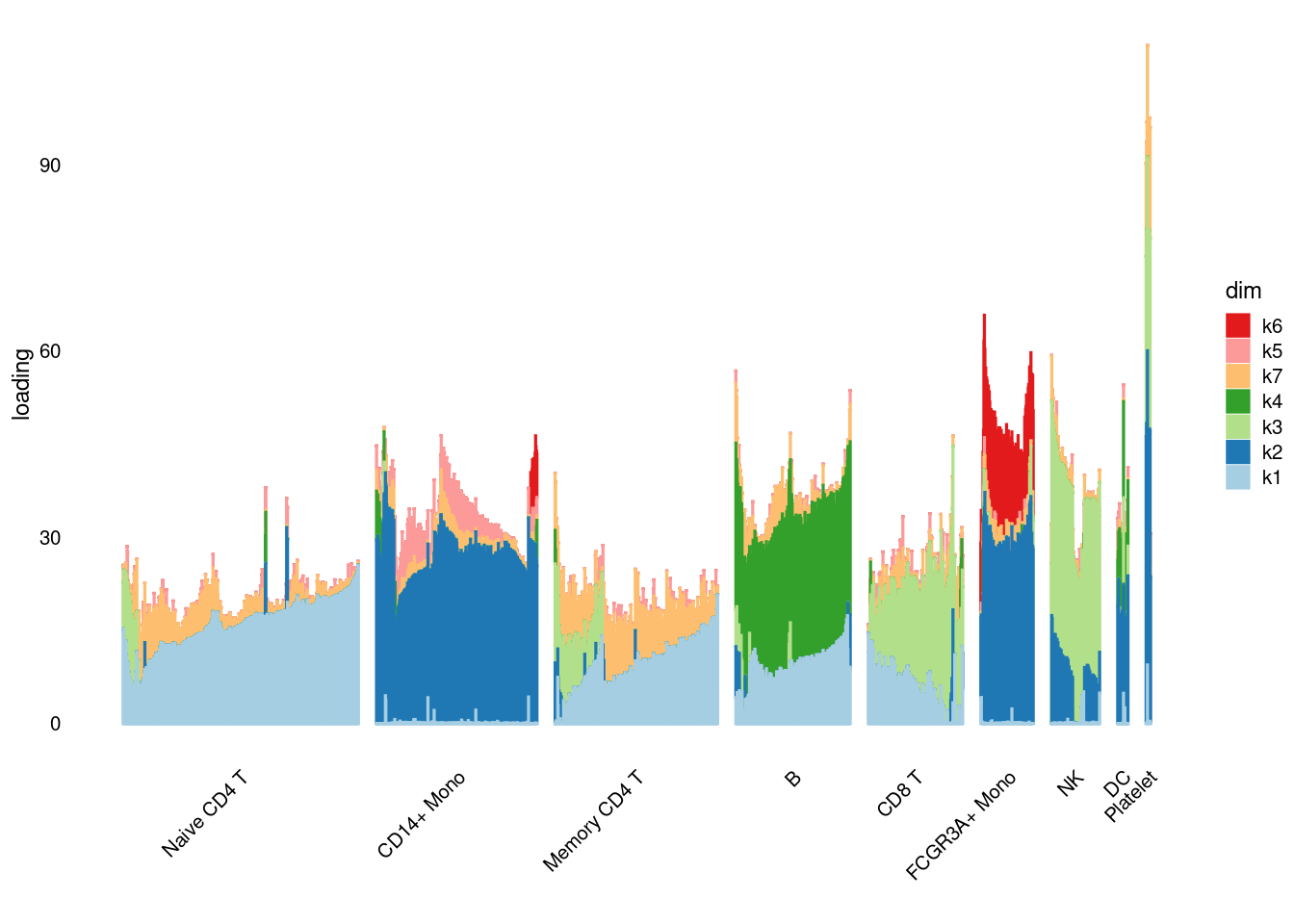 structure_plot_general(pbmc3k_nonnegLF_un$fit_flash$L.pm,pbmc3k_nonnegLF_un$fit_flash$F.pm,pbmc3k$cell_type,LD=T)