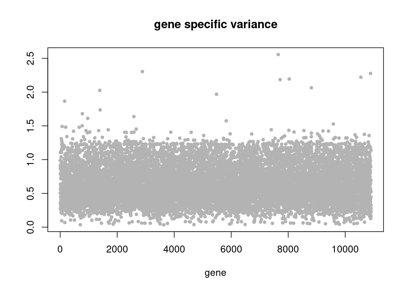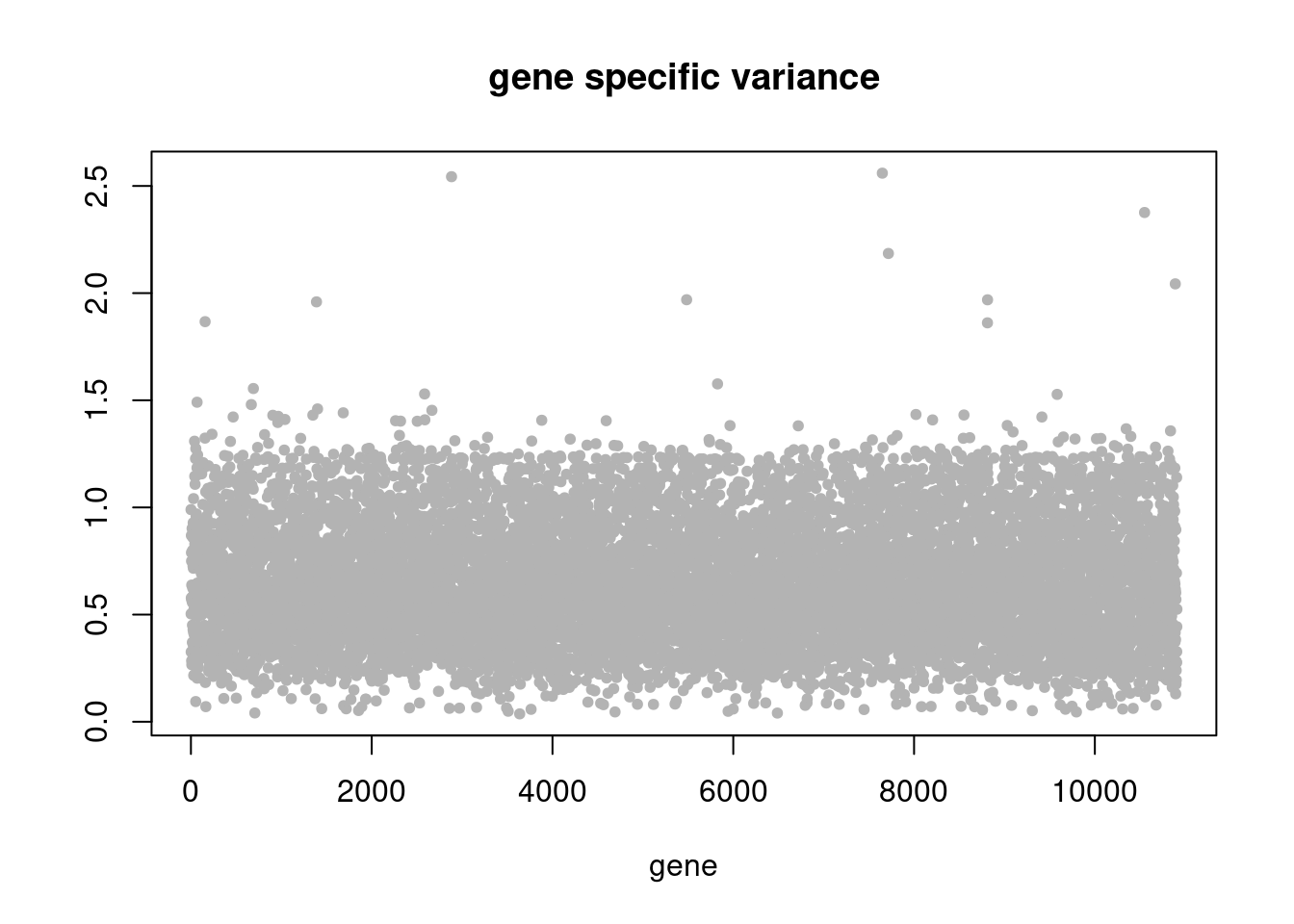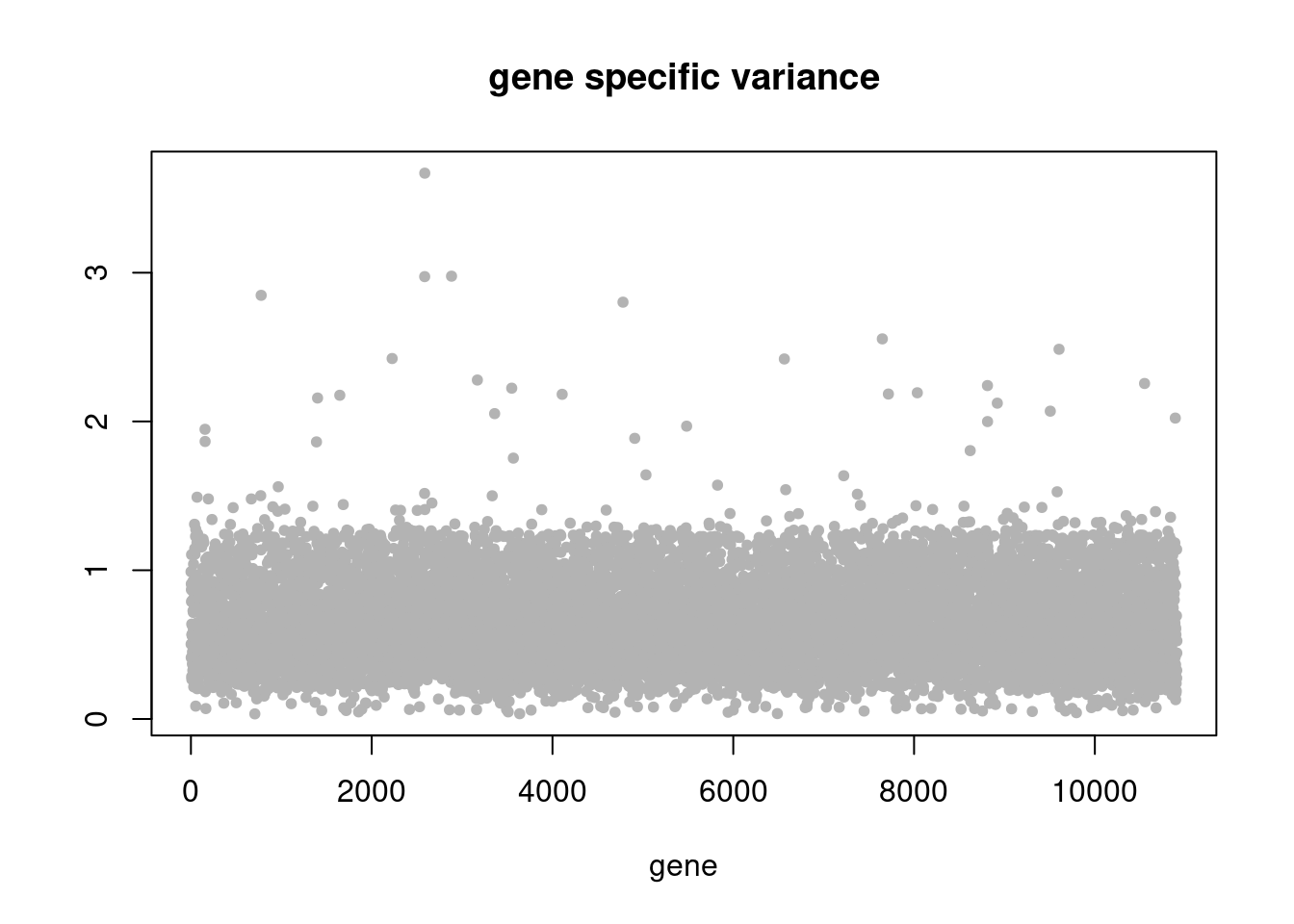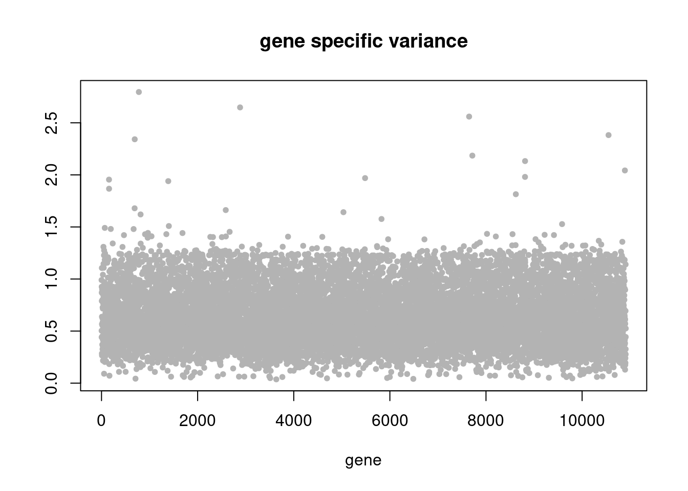 plot(res$sigma2,ylab='',xlab='gene',main = 'gene specific variance',pch=20,col='grey70')