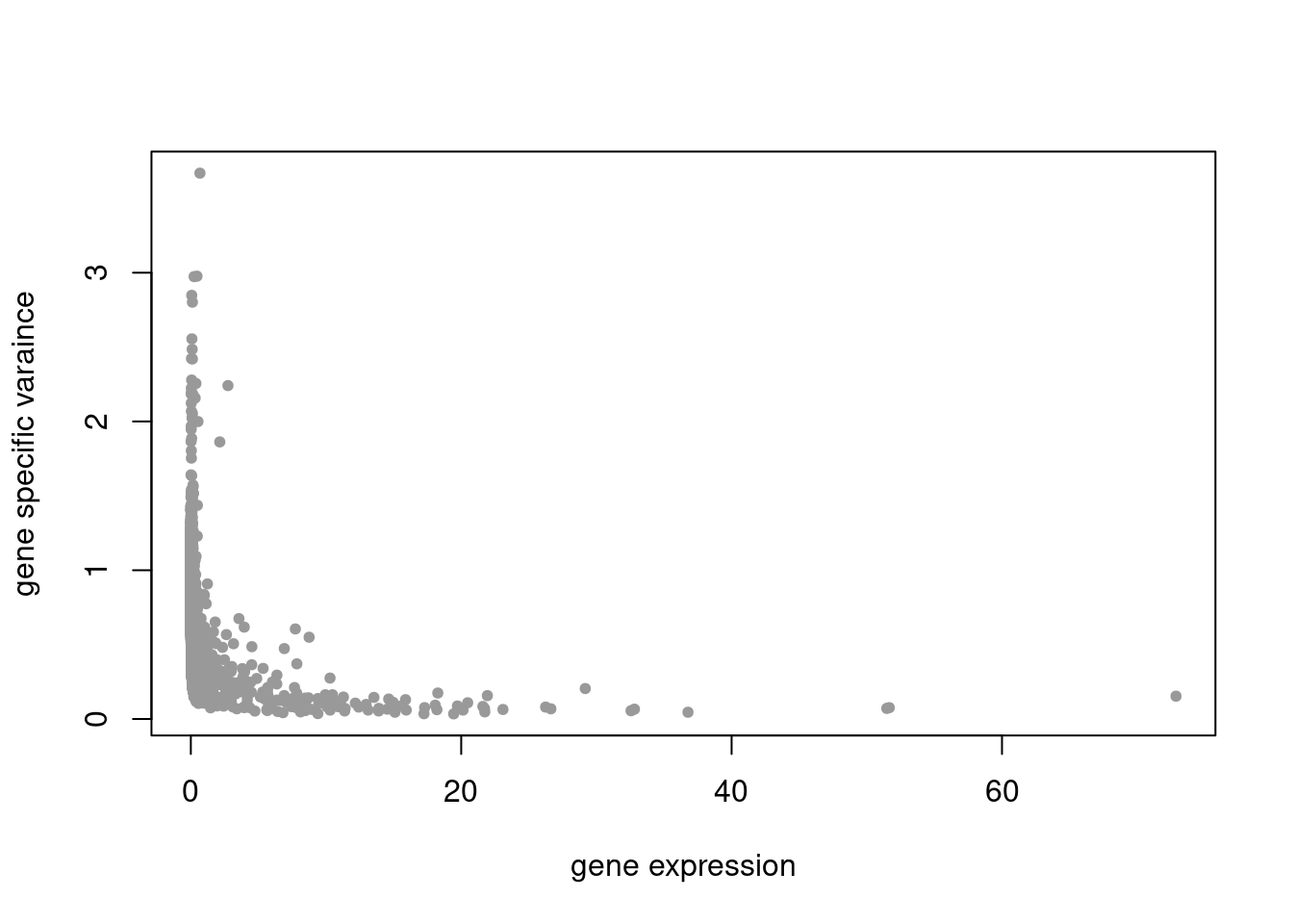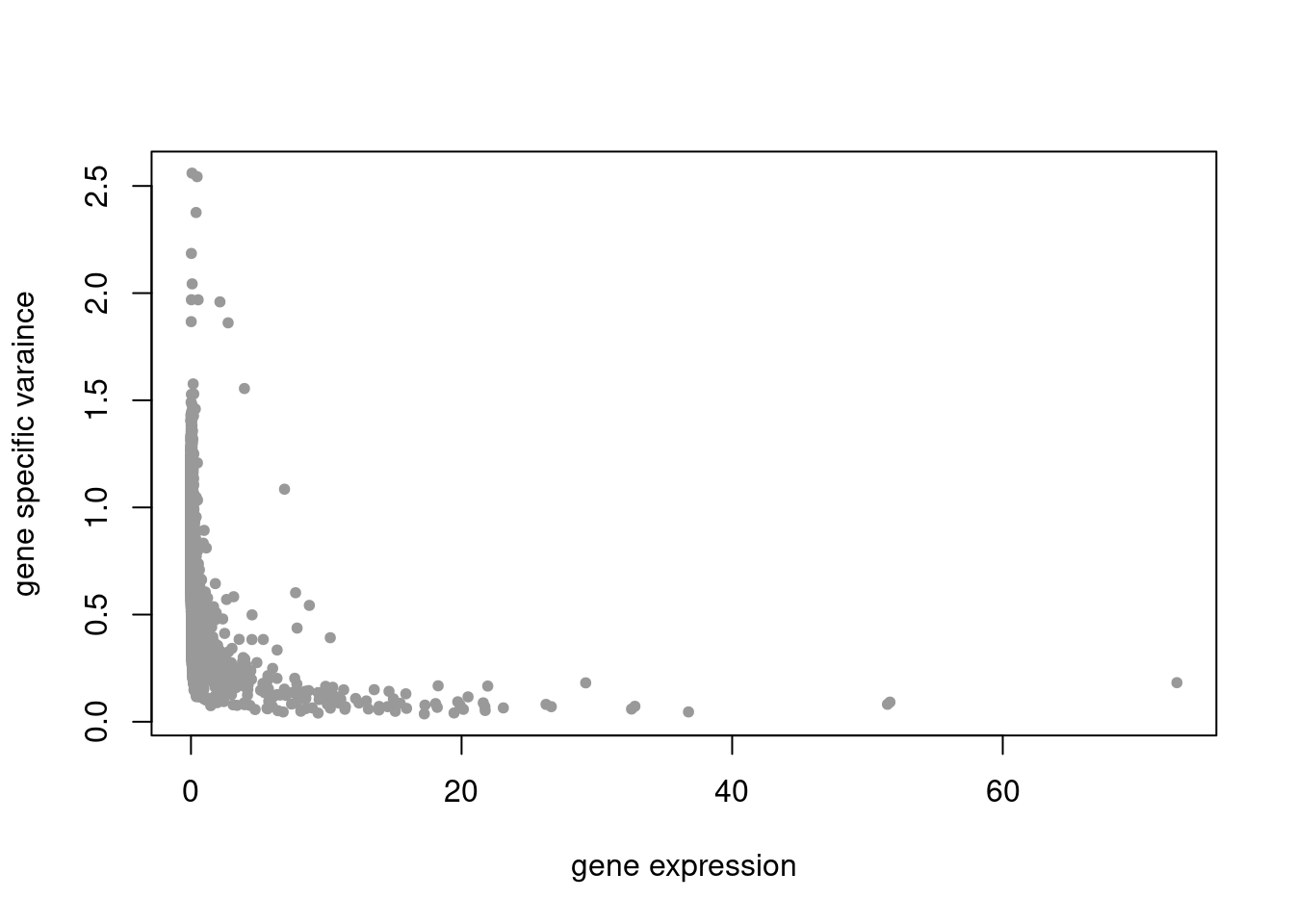 plot(colSums(counts_filtered/rowSums(counts_filtered)),res$sigma2,xlab='gene expression',ylab='gene specific varaince',pch=20,col='grey60')