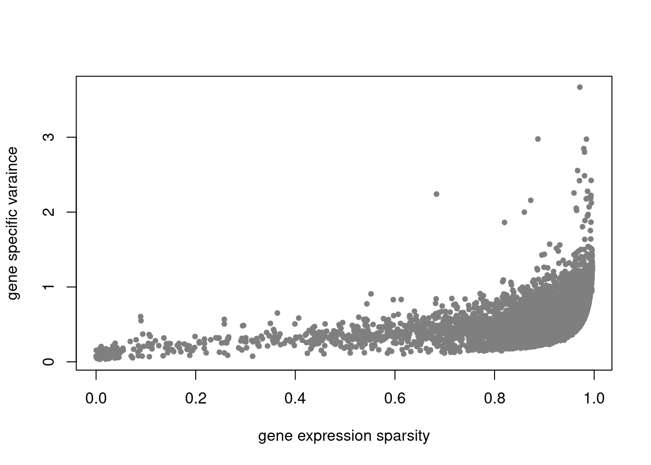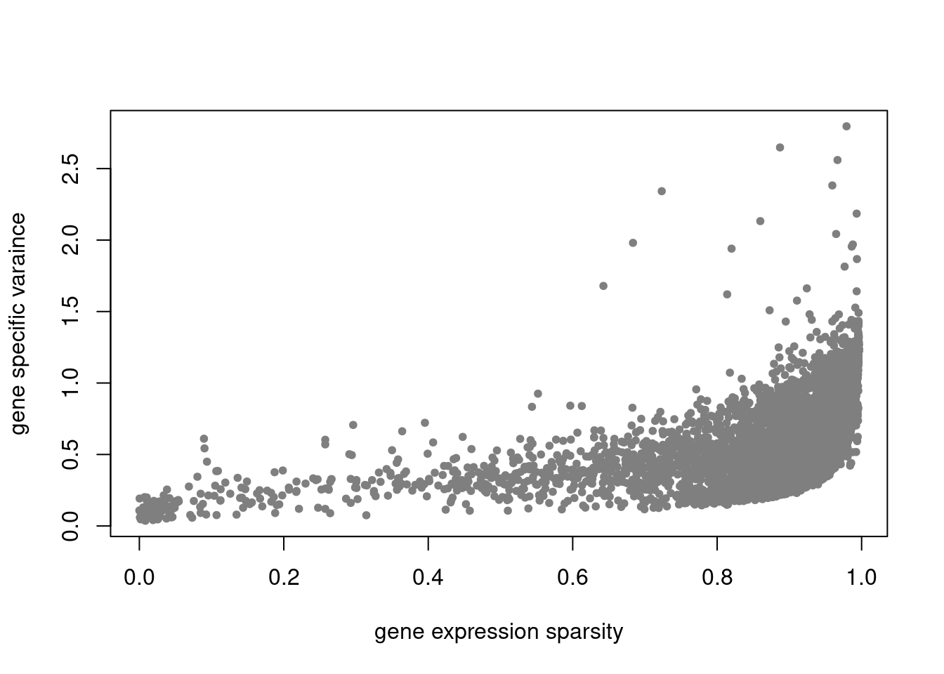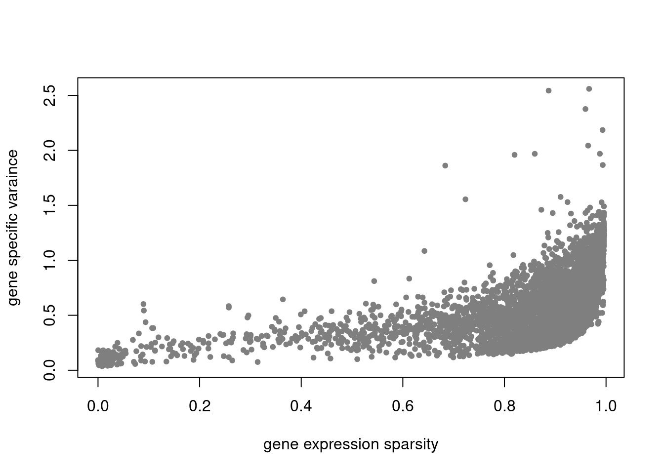 plot(colSums(counts_filtered==0)/nrow(counts_filtered),res$sigma2,xlab='gene expression sparsity',ylab='gene specific varaince',pch = 20, col='grey50')