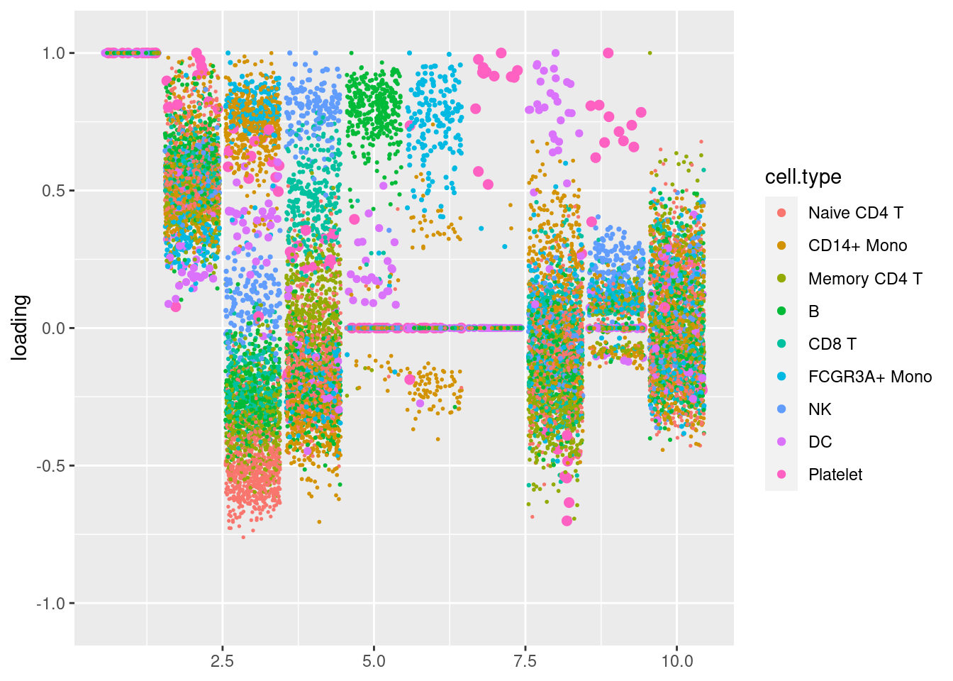 plot.factors(pbmc3k_nonnegL_pe$fit_flash,pbmc3k$cell_type,nonnegative = T)