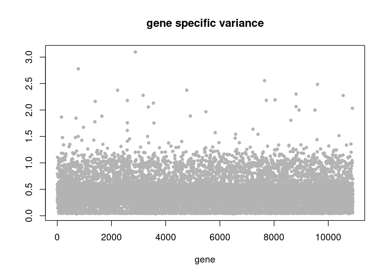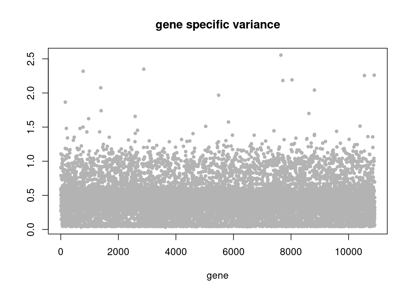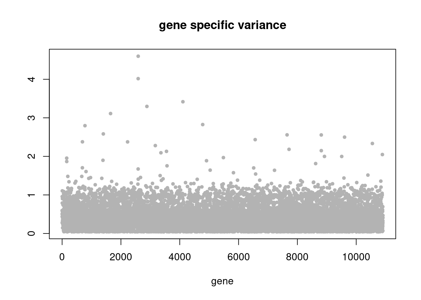 plot(res$sigma2,ylab='',xlab='gene',main = 'gene specific variance',pch=20,col='grey70')