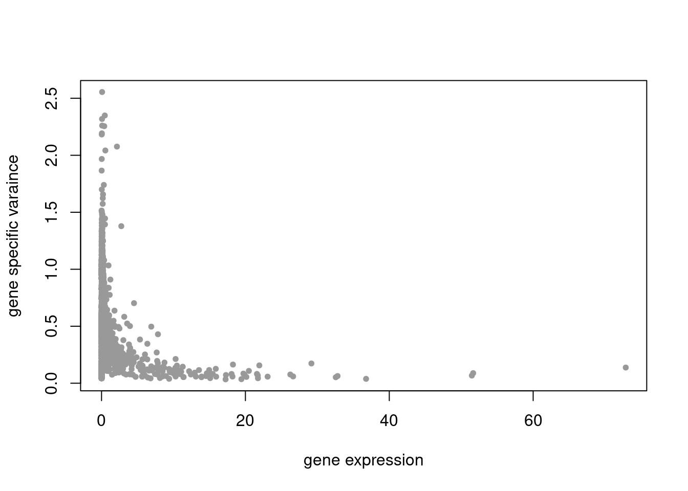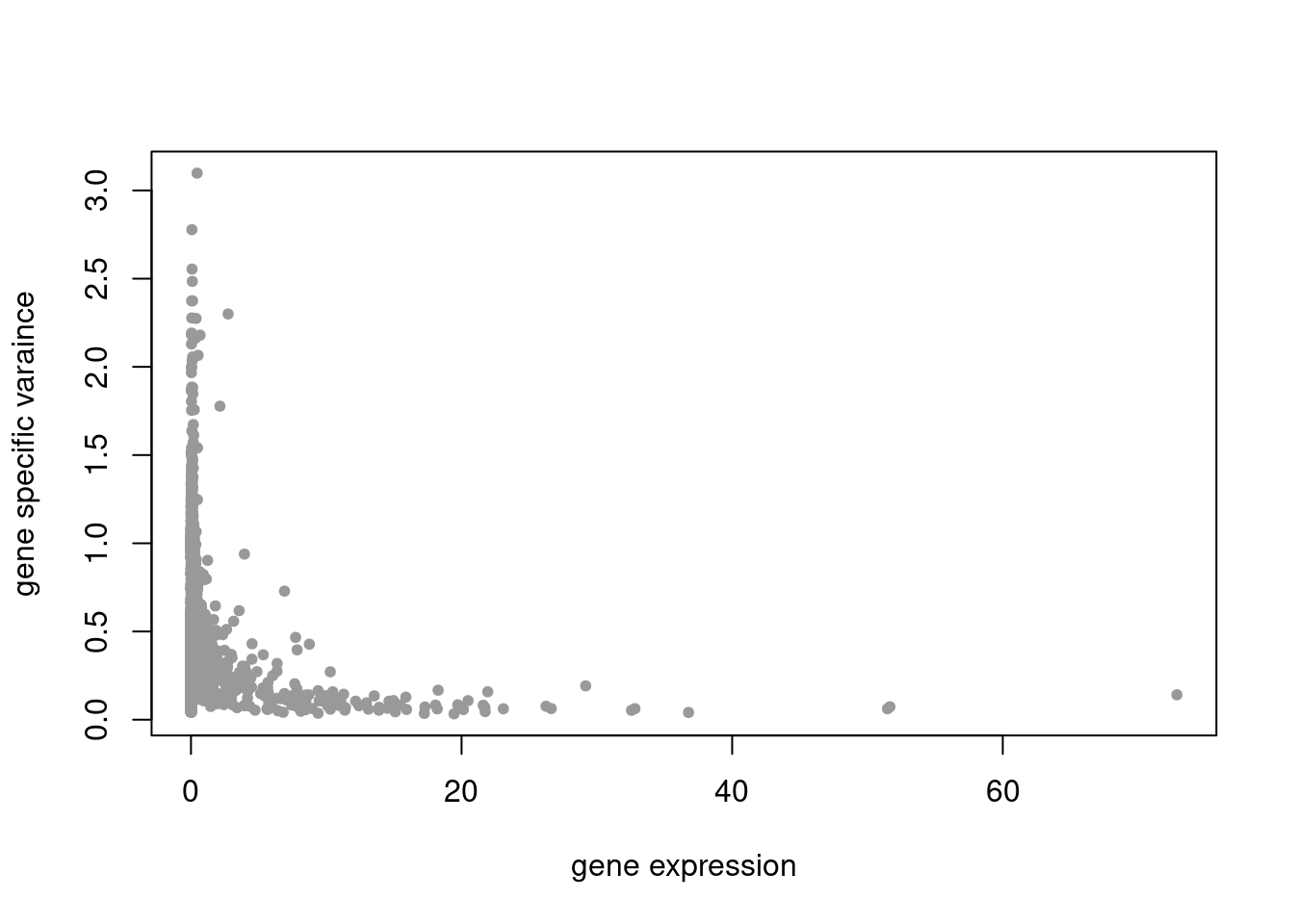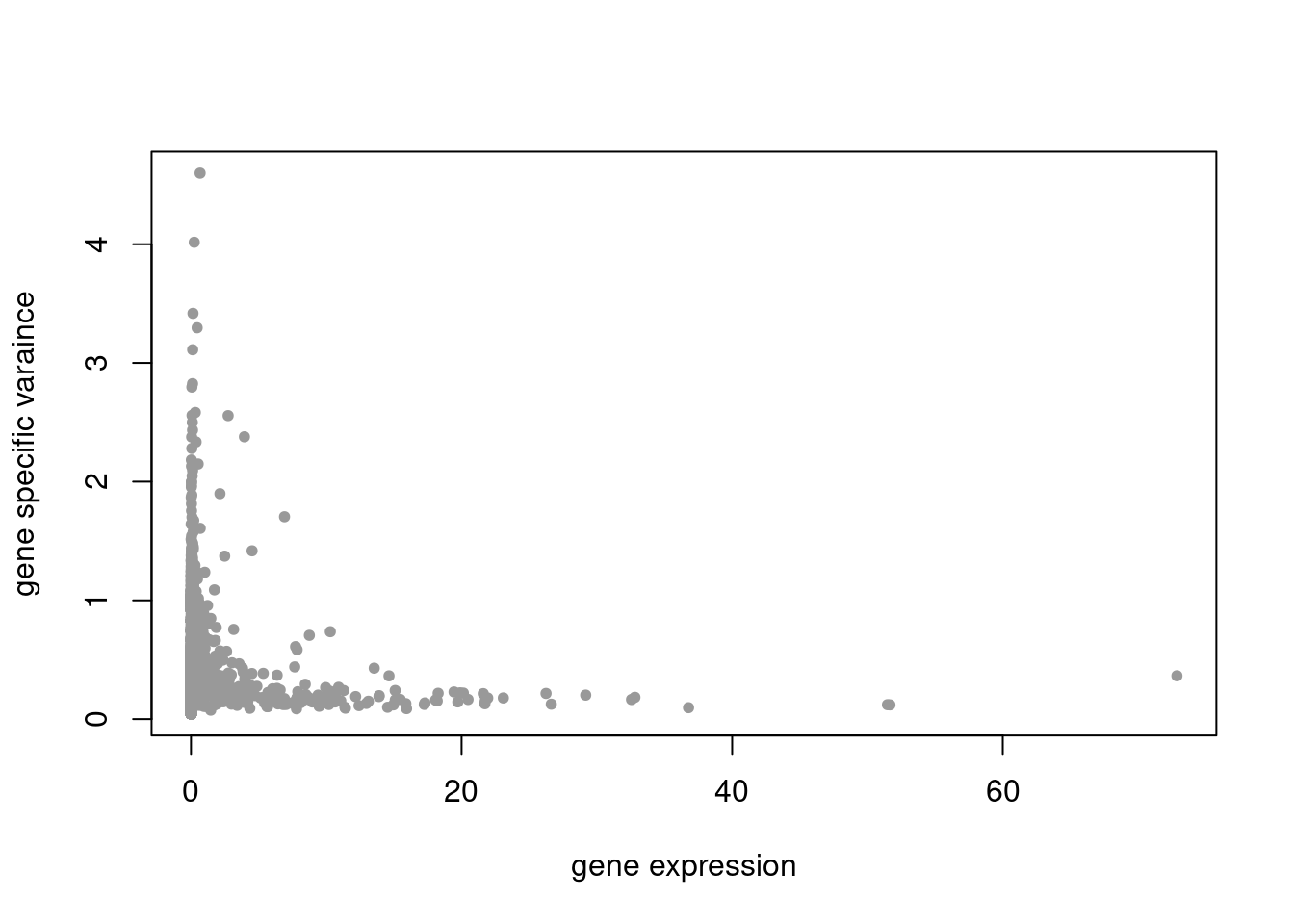 plot(colSums(counts_filtered/rowSums(counts_filtered)),res$sigma2,xlab='gene expression',ylab='gene specific varaince',pch=20,col='grey60')