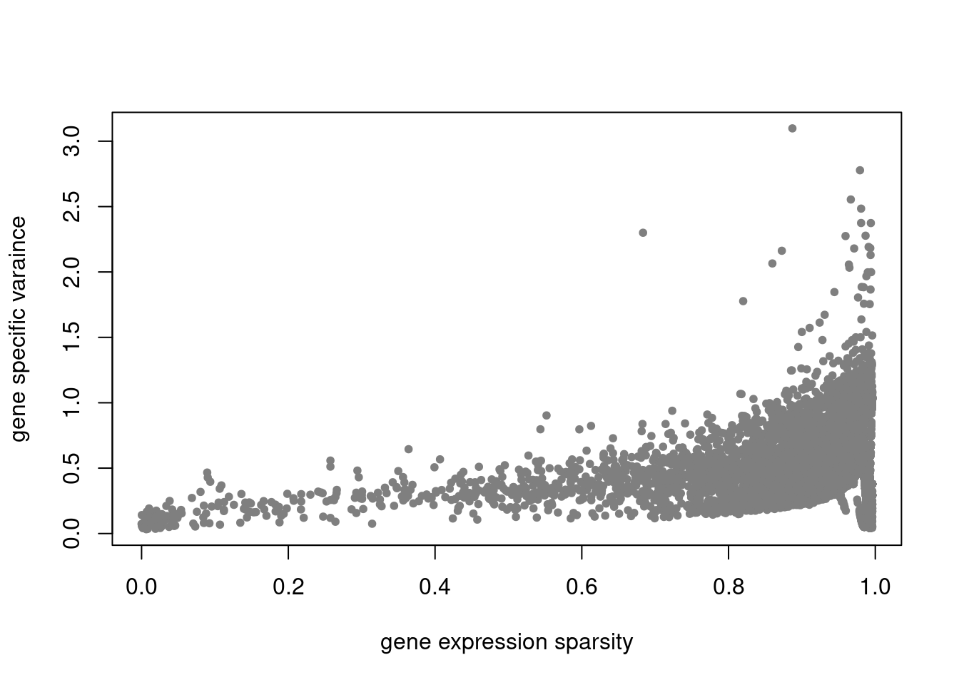 plot(colSums(counts_filtered==0)/nrow(counts_filtered),res$sigma2,xlab='gene expression sparsity',ylab='gene specific varaince',pch = 20, col='grey50')