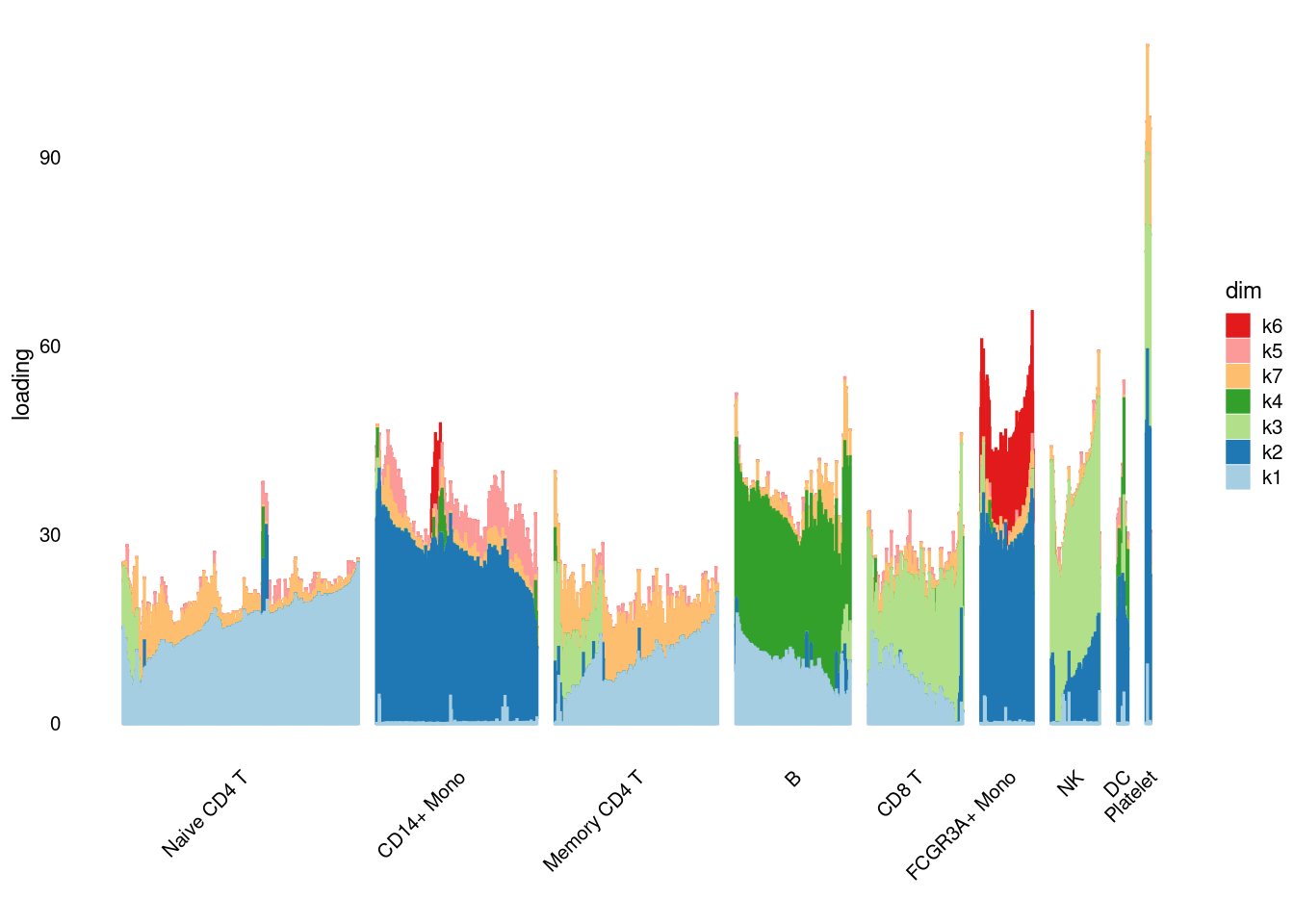 structure_plot_general(pbmc3k_nonnegLF_pe$fit_flash$L.pm,pbmc3k_nonnegLF_pe$fit_flash$F.pm,pbmc3k$cell_type,LD=T)