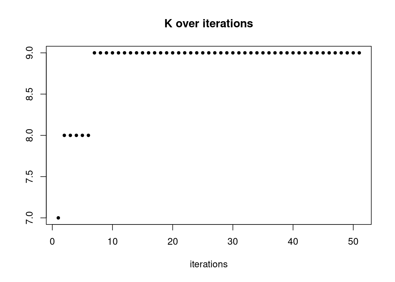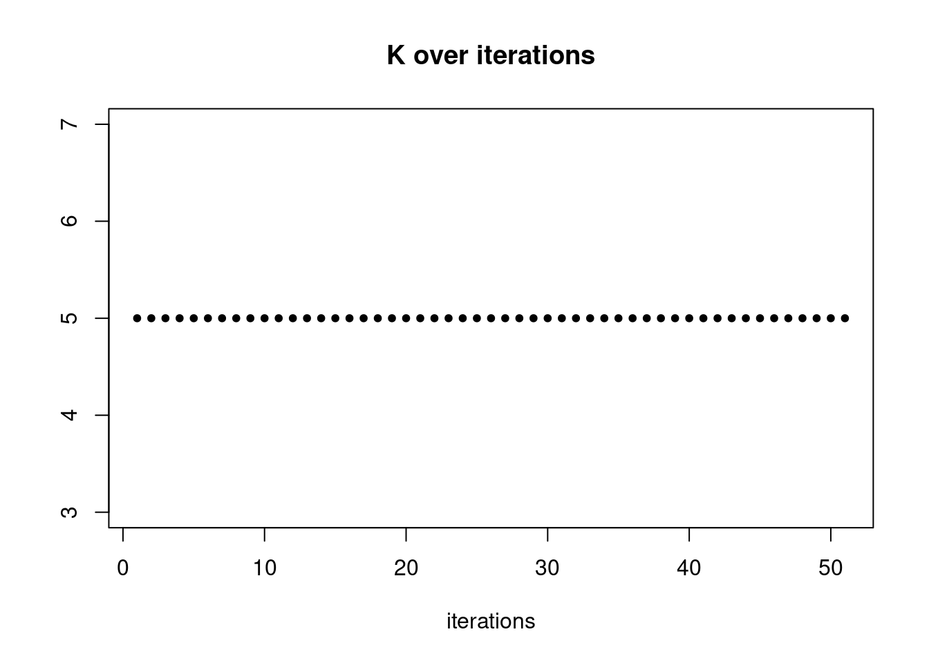 plot(res$K_trace,ylab='',xlab='iterations',main='K over iterations',pch=20)