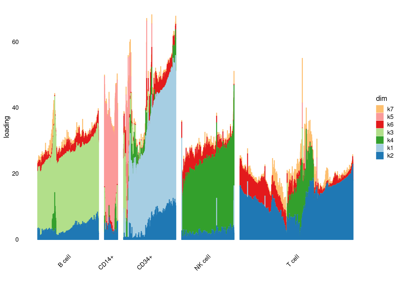 structure_plot_general(pbmc3k_nonnegLF_pe$fit_flash$L.pm,pbmc3k_nonnegLF_pe$fit_flash$F.pm,pbmc_facs$samples$subpop,LD=T)