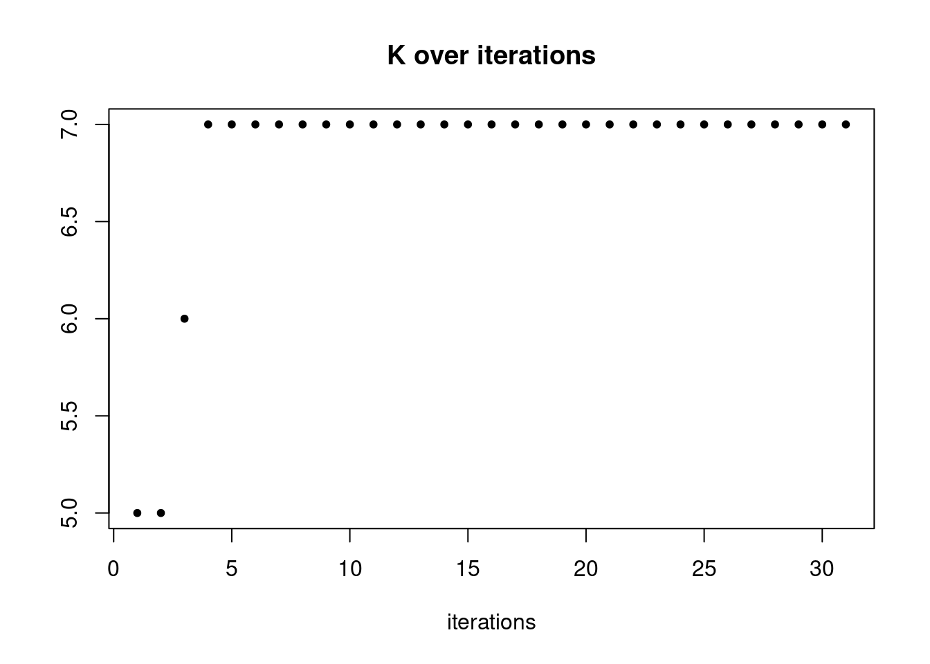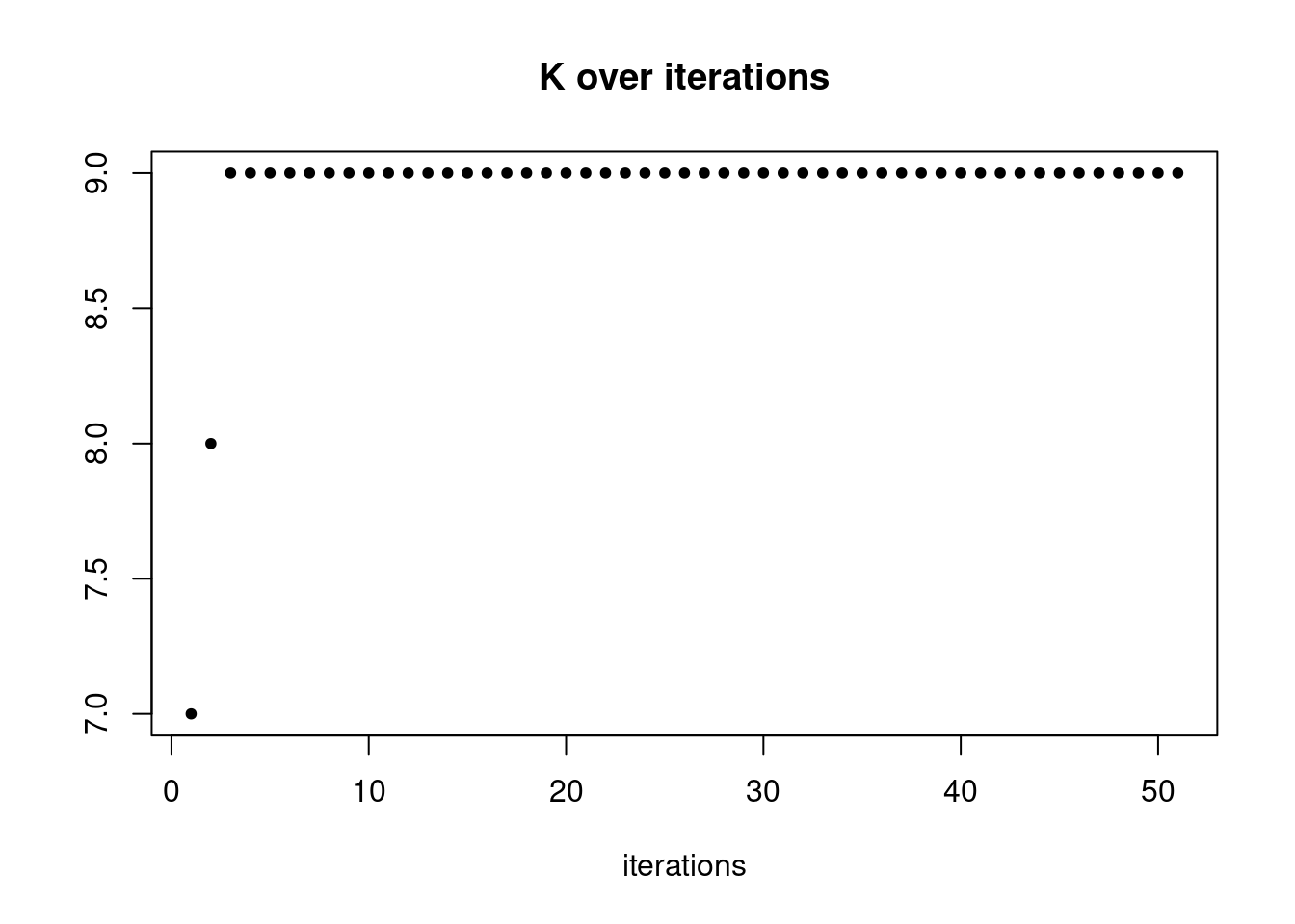 plot(res$K_trace,ylab='',xlab='iterations',main='K over iterations',pch=20)