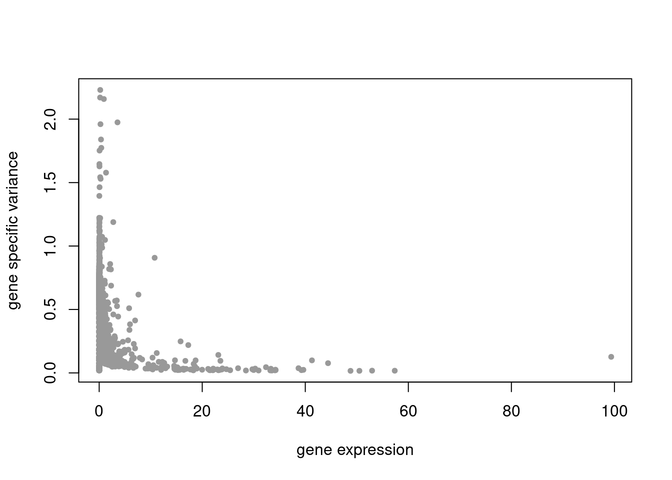 plot(colSums(counts_filtered/rowSums(counts_filtered)),res$sigma2,xlab='gene expression',ylab='gene specific variance',pch=20,col='grey60')