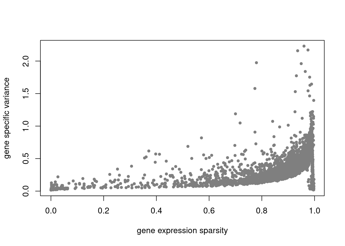 plot(colSums(counts_filtered==0)/nrow(counts_filtered),res$sigma2,xlab='gene expression sparsity',ylab='gene specific variance',pch = 20, col='grey50')