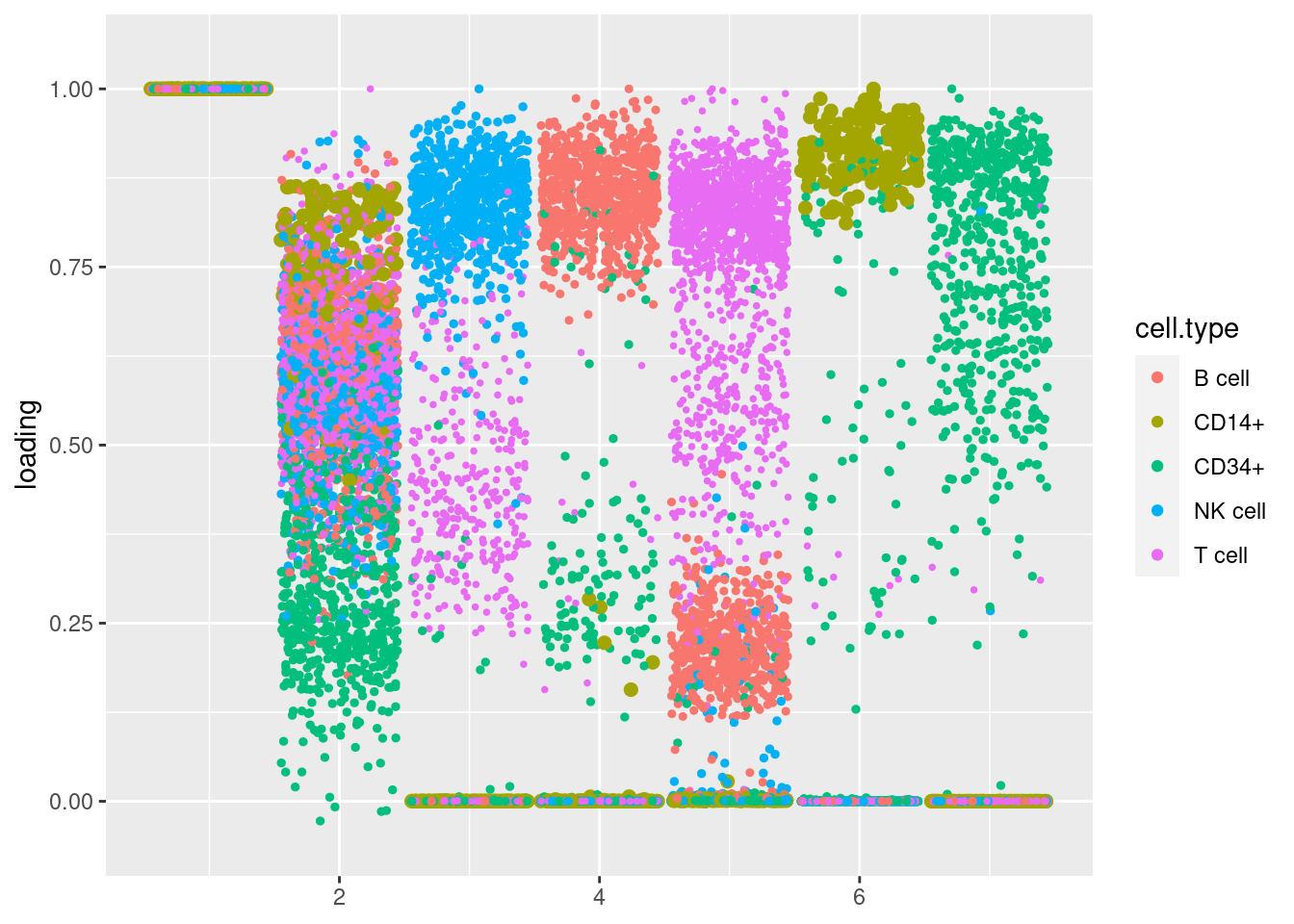 plot.factors(pbmc3k_nonnegLF_pe$fit_flash,pbmc_facs$samples$subpop,nonnegative = T)