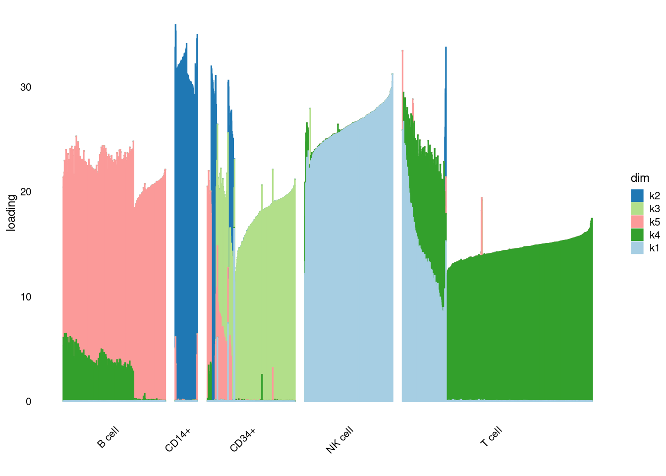 structure_plot_general(pbmc3k_nonnegL_pe$fit_flash$L.pm,pbmc3k_nonnegL_pe$fit_flash$F.pm,pbmc_facs$samples$subpop,LD=T)
