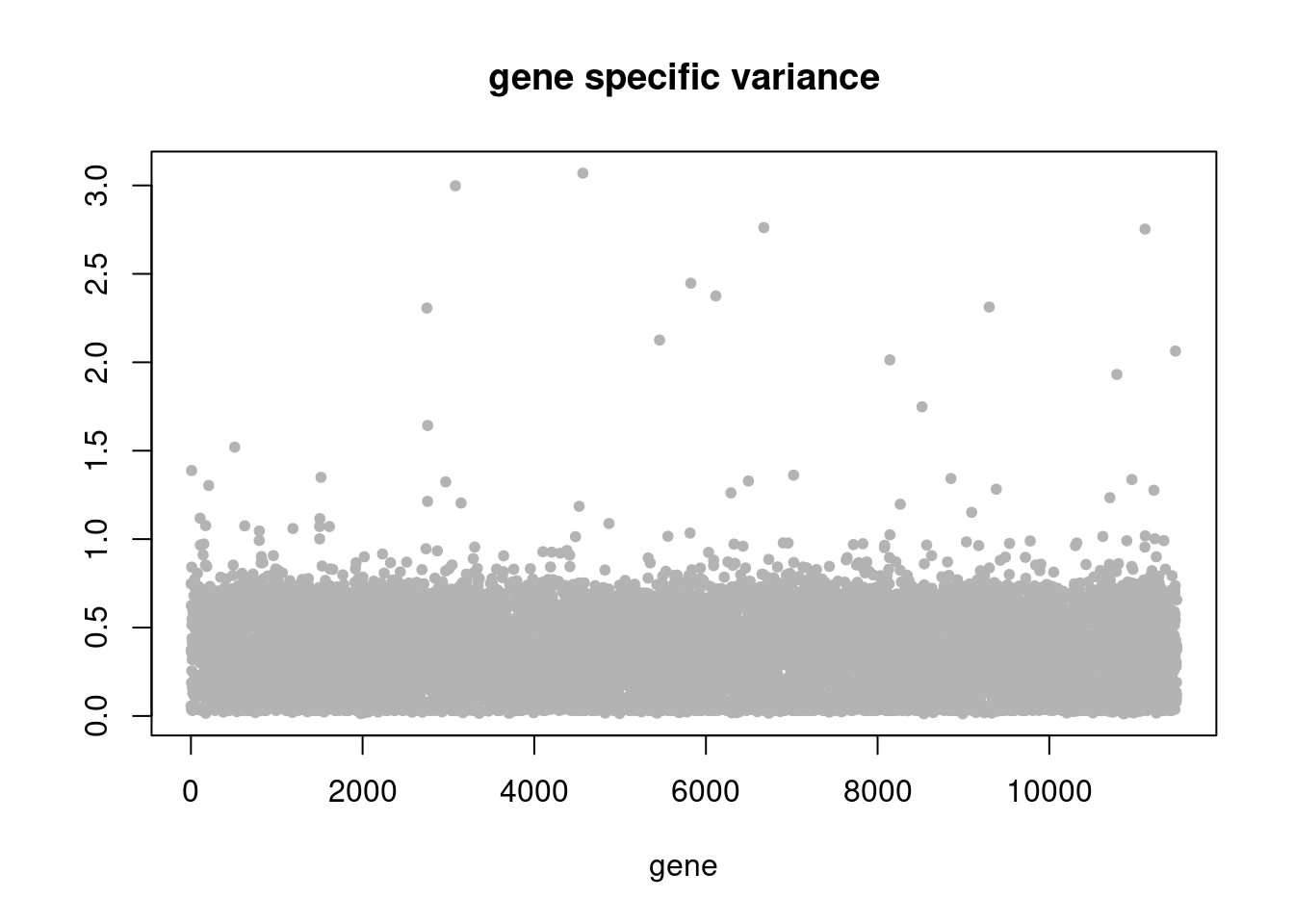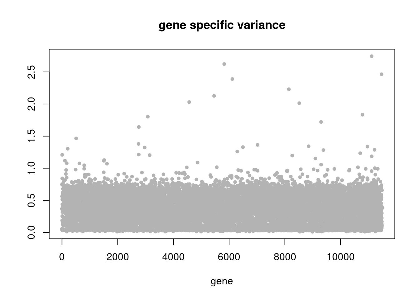 plot(res$sigma2,ylab='',xlab='gene',main = 'gene specific variance',pch=20,col='grey70')