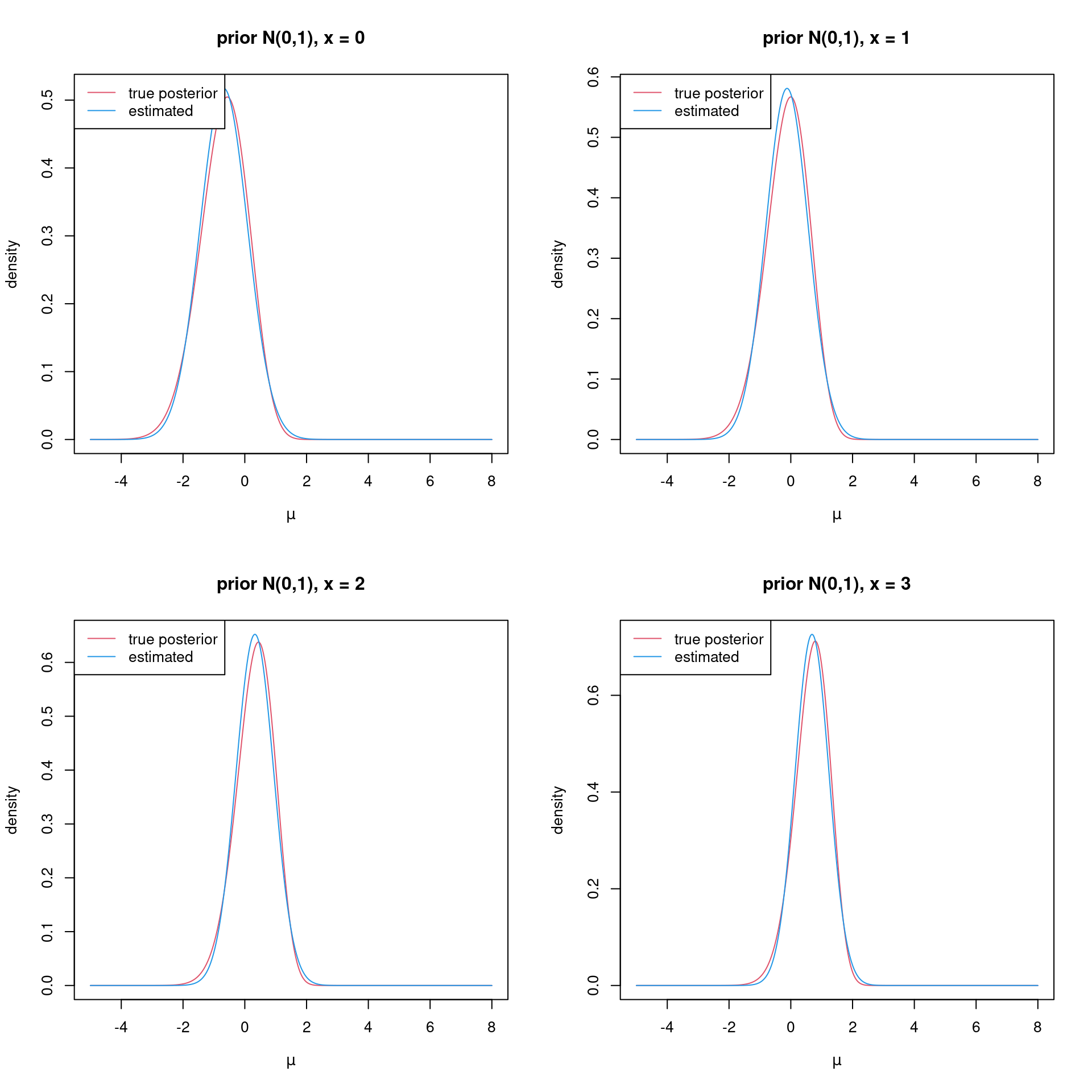 legend('topleft',c('true posterior','estimated'),lty=c(1,1),col=c(2,4))