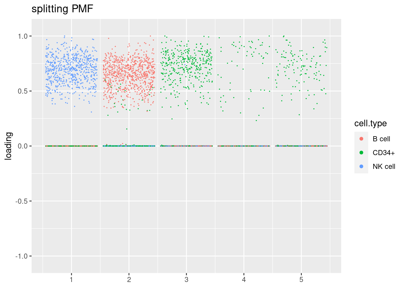 plot.factors(fit$fit_flash,cell_names,title='splitting PMF')