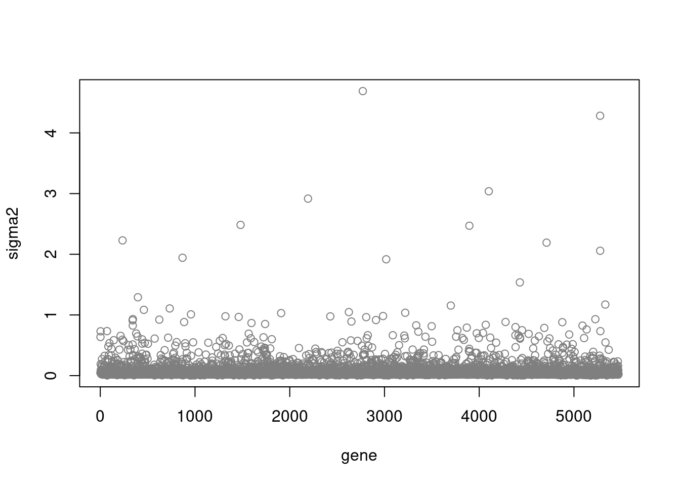 plot(fit$sigma2,ylab = 'sigma2',xlab='gene',col='grey50')