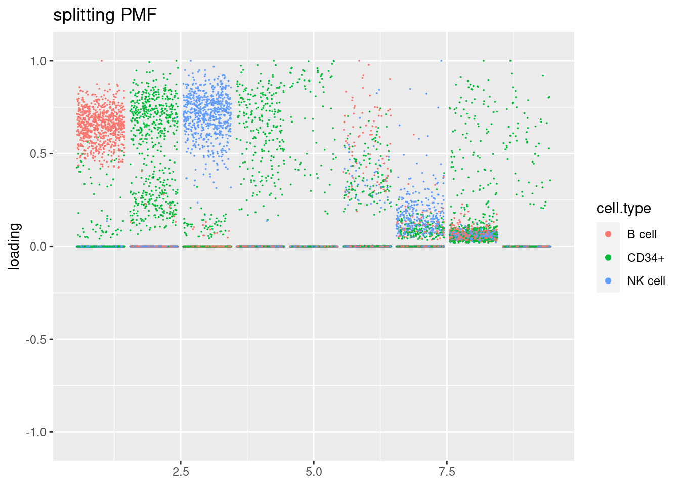 plot.factors(fit$fit_flash,cell_names,title='splitting PMF')