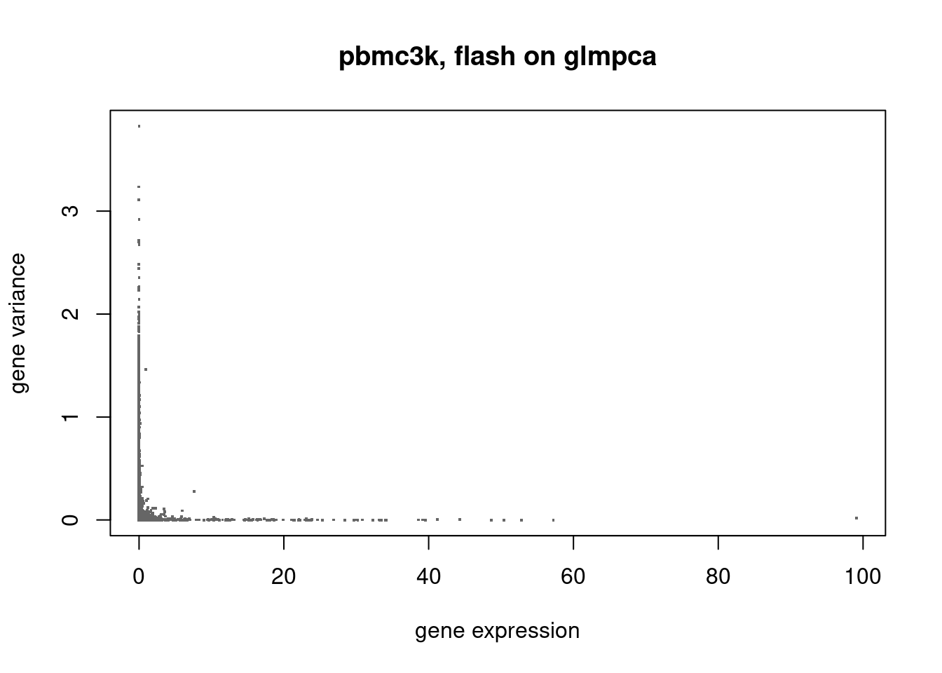 plot(colSums(pbmc_facs$counts/rowSums(pbmc_facs$counts)),flash_glmpca$residuals.sd^2,xlab='gene expression',ylab='gene variance',main='pbmc3k, flash on glmpca',pch='.',cex=2,col='grey40')