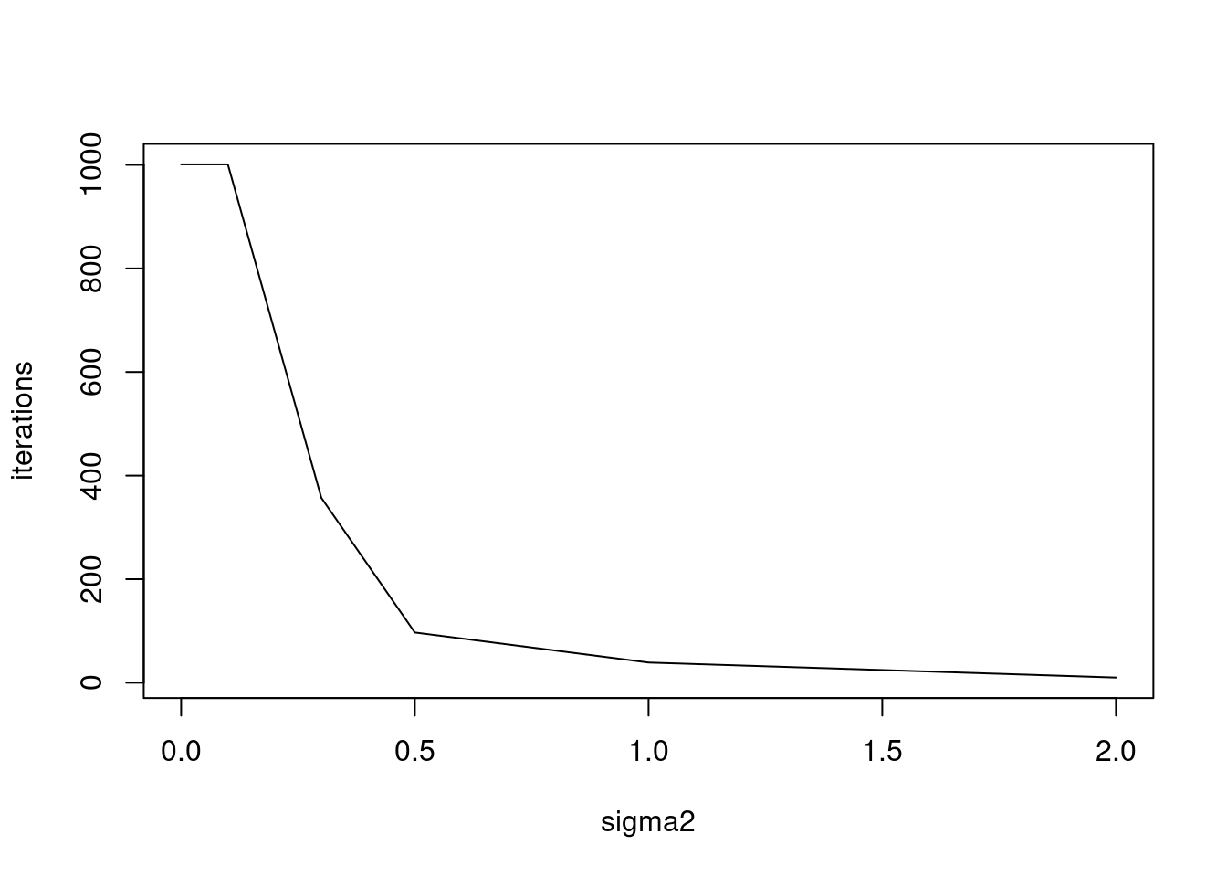 plot(sigma2_list,res,xlab='sigma2',ylab='iterations',type='l')