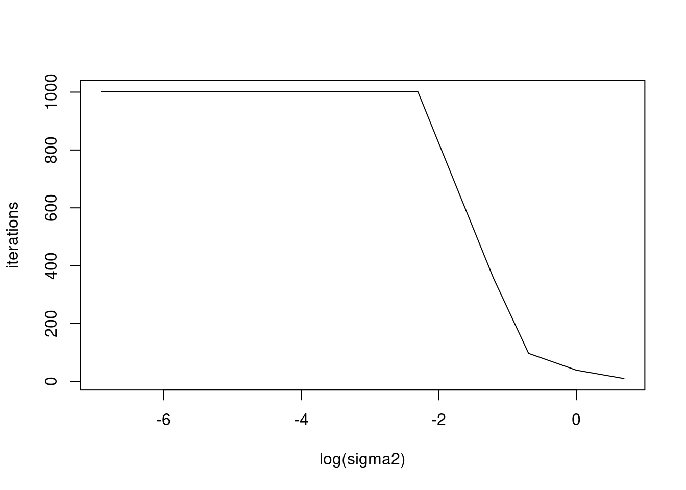 plot(log(sigma2_list),res,xlab='log(sigma2)',ylab='iterations',type='l')