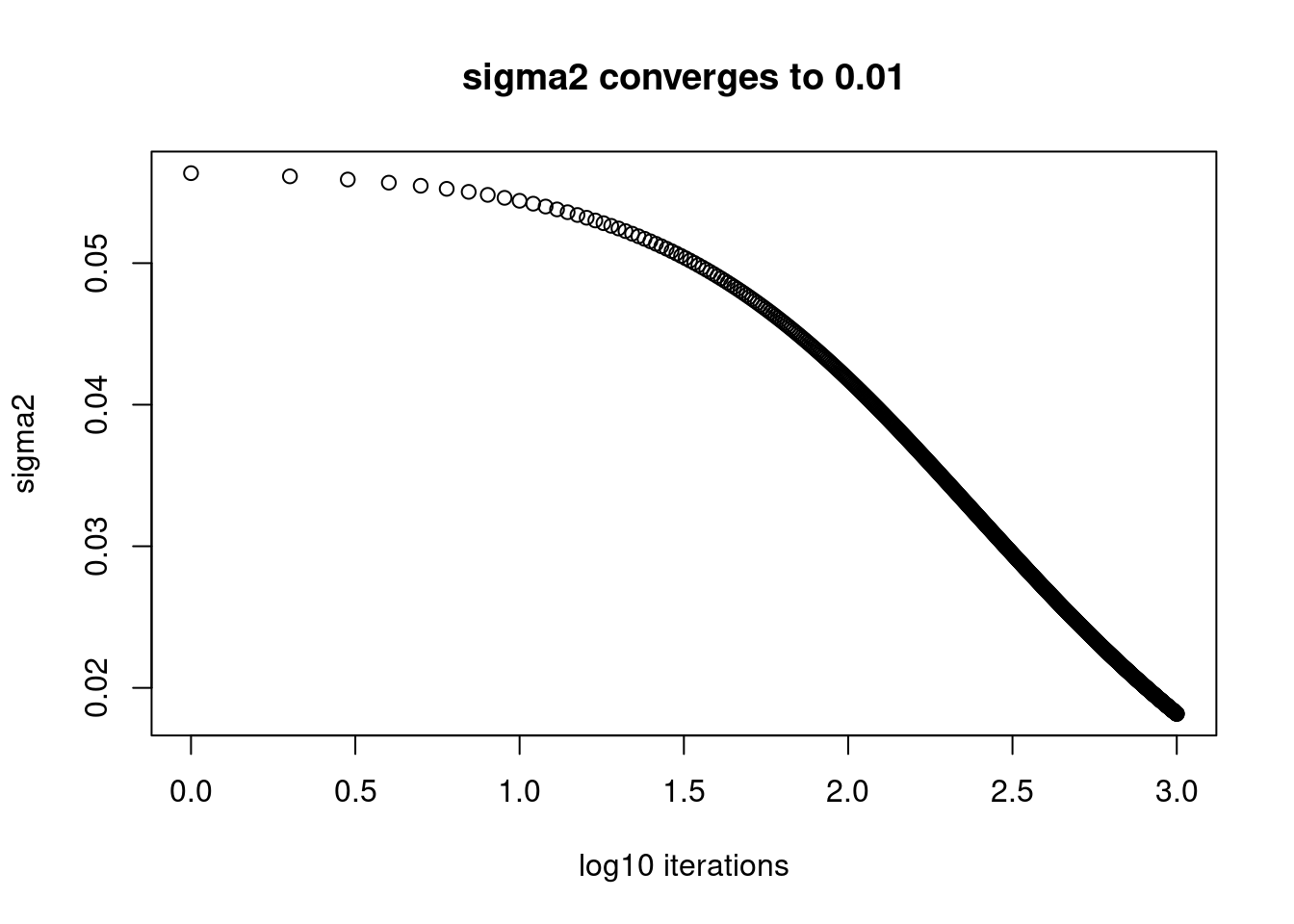 plot(log10(1:1001),fit$sigma2_trace[,600],xlab='log10 iterations',ylab='sigma2',main='sigma2 converges to 0.01')