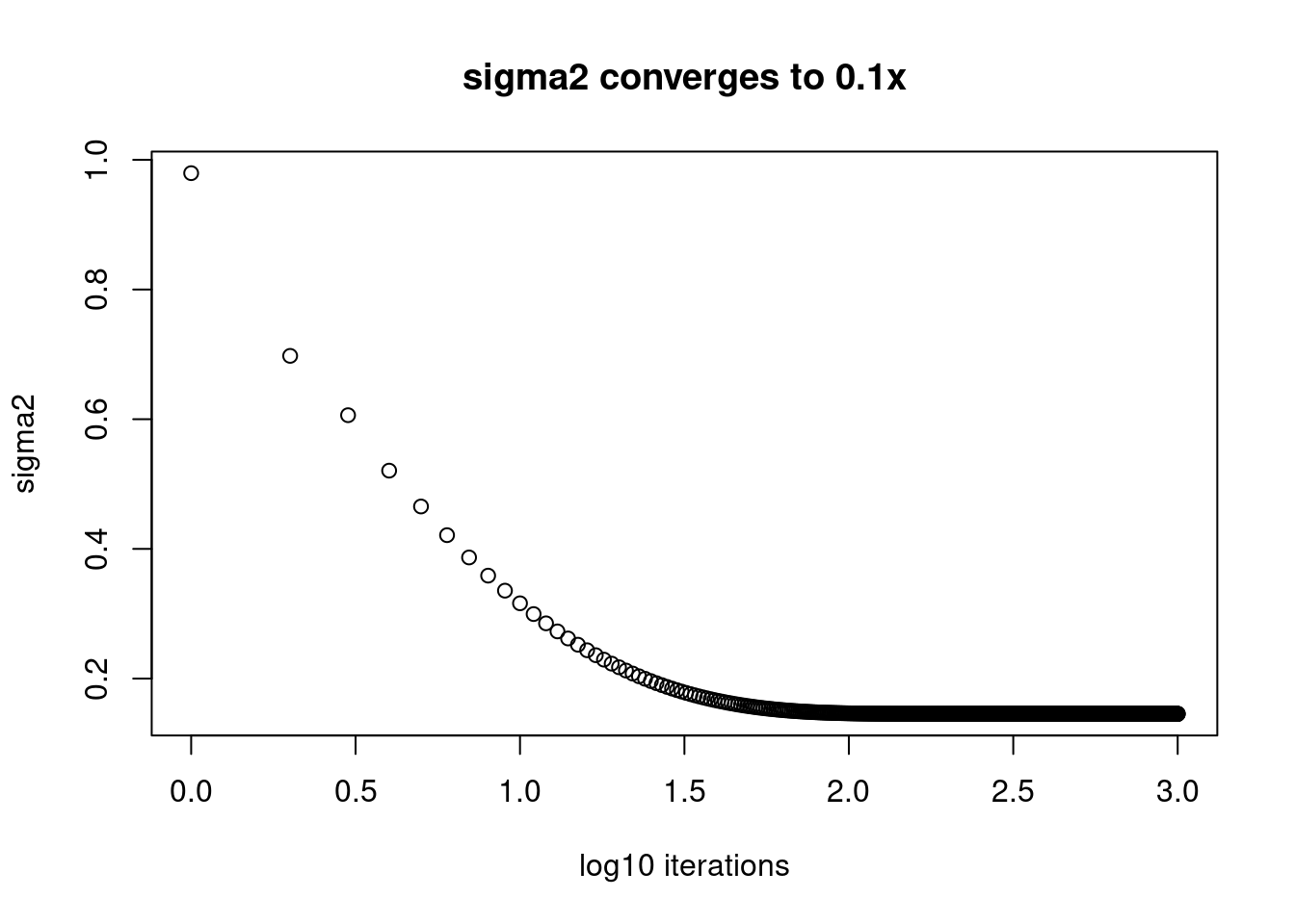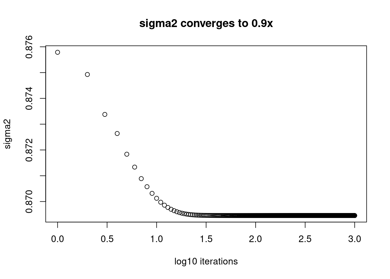 plot(log10(1:1001),fit$sigma2_trace[,100],xlab='log10 iterations',ylab='sigma2',main='sigma2 converges to 0.9x')