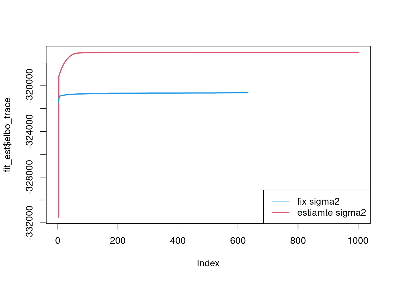 legend('bottomright',c('fix sigma2','estiamte sigma2'),lty=c(1,1),col=c(4,2))
