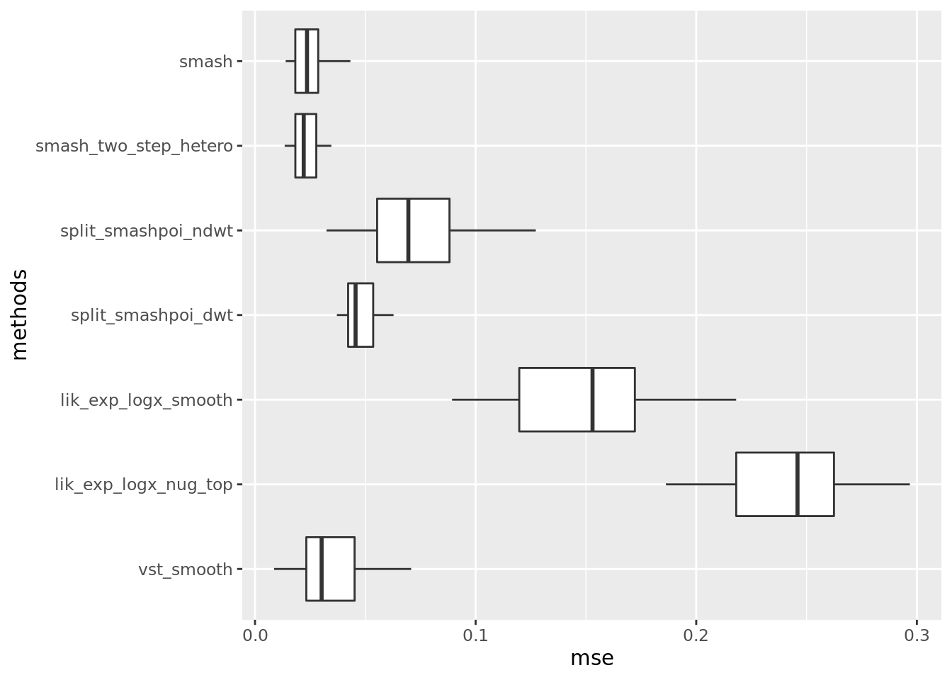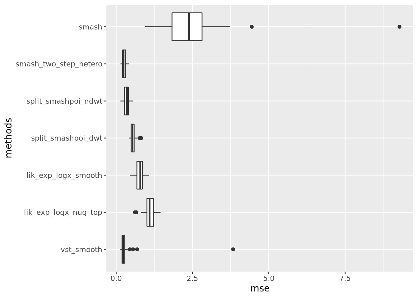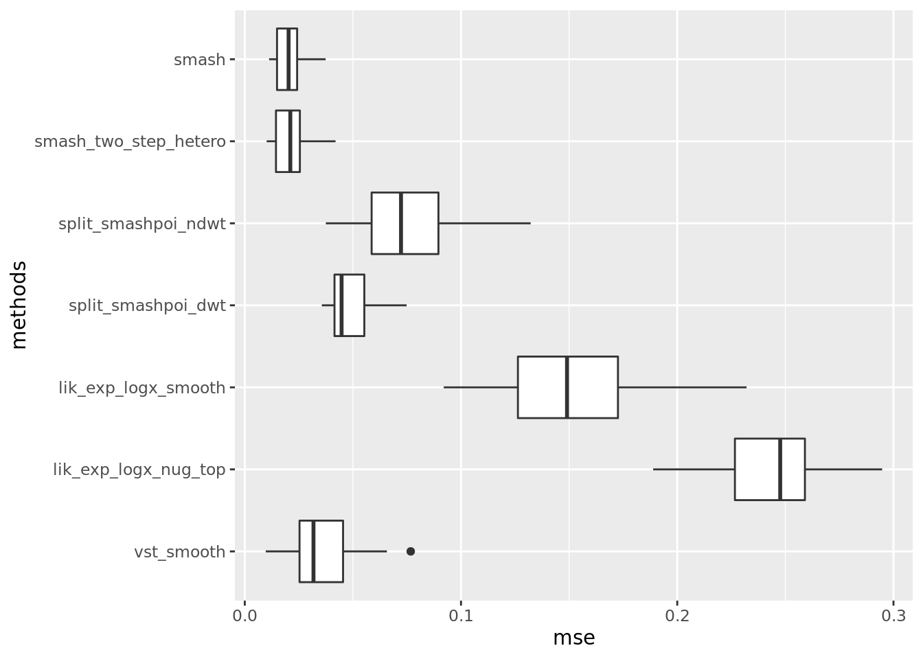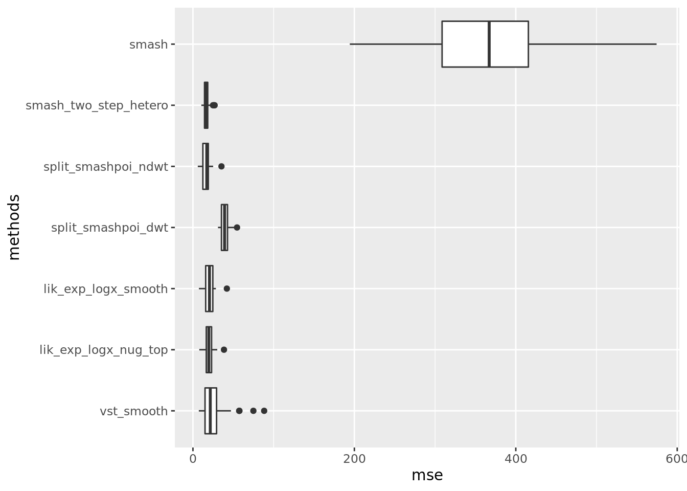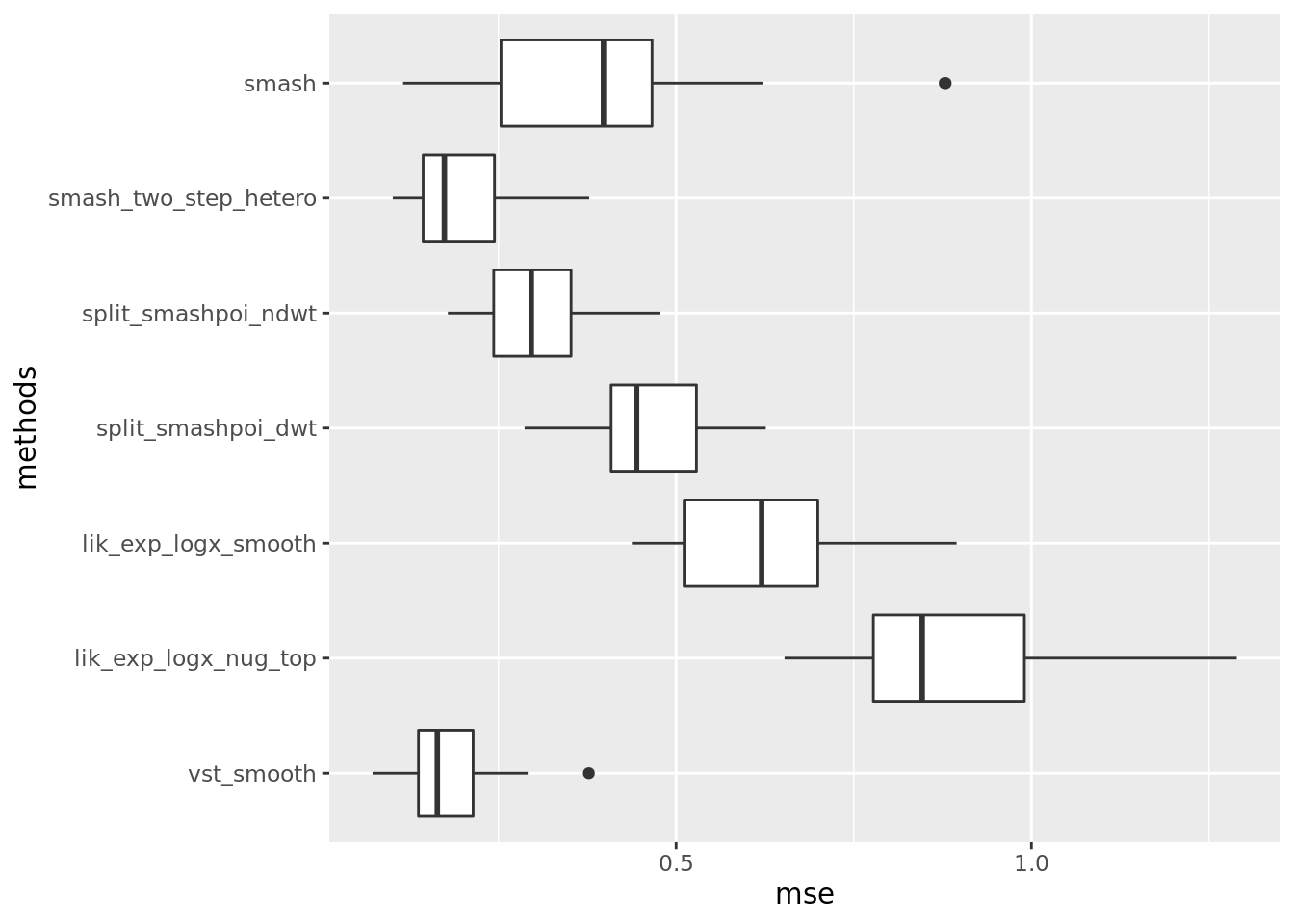 include_methods = c('vst_smooth','lik_exp_logx_nug_top','lik_exp_logx_smooth','split_smashpoi_ndwt','split_smashpoi_dwt','smash_two_step_hetero','smash')