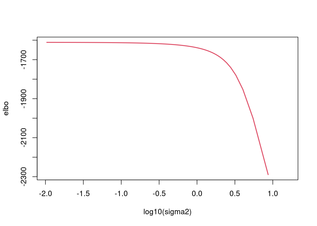 plot(log10(fit$sigma2_trace),fit$obj_trace,xlab='log10(sigma2)',ylab='elbo',type='l',lwd=2,col=2)