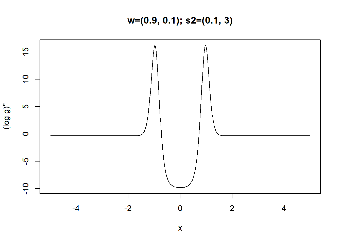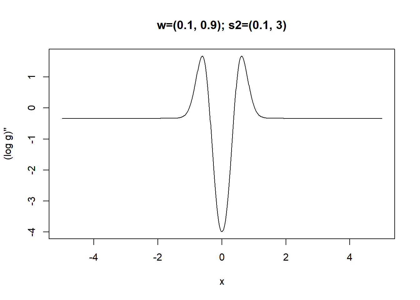 plot(x,lg_d2_vec(x,w,s2),type='l',xlab='x',ylab="(log g)''",