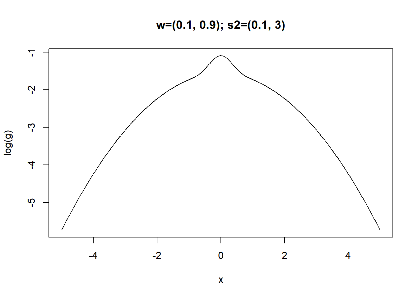 plot(x,lg_vec(x,w,s2),type='l',xlab='x',ylab='log(g)',