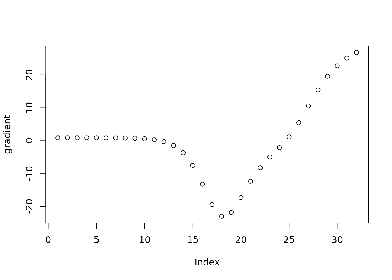 plot(vebpm:::f_obj_grad(out$output[[1]]$fitted_model$penalty_inversion$fit$optim_fit$par,out$sim_data$X[1,],out$output[[1]]$fitted_model$penalty_inversion$fitted_g$sd)[1001:1032],ylab='gradient')