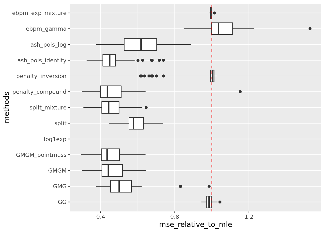 We compare the methods with log-link on estimating the latent \(\mu\) under the following simulation settings. We generate \(n=1000\) samples from \(y_j\sim \Poi(\exp(\mu_j))\), and \(\mu_j\) are generated under the following different data-generating distributions. Each simulation was repeated for 50 times.