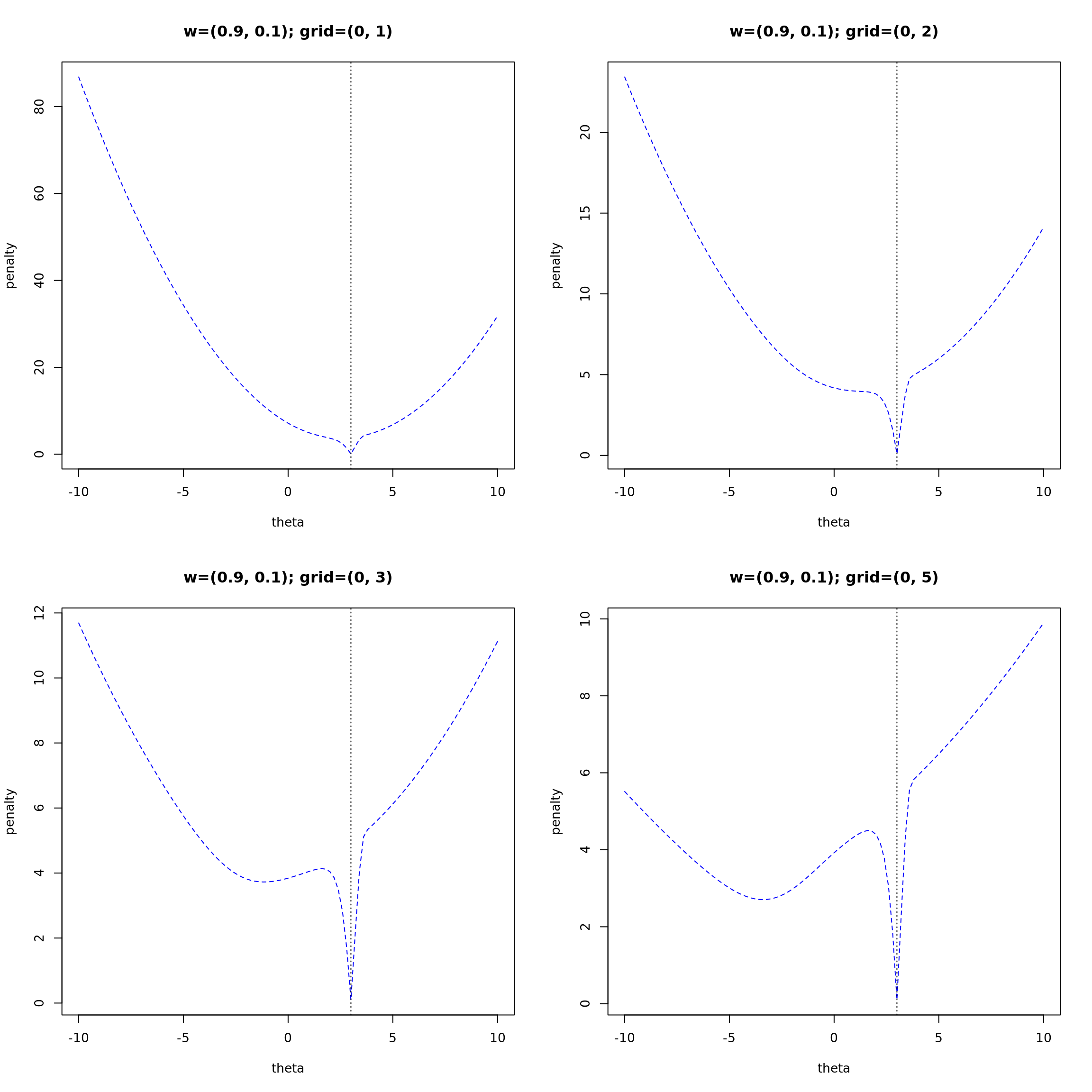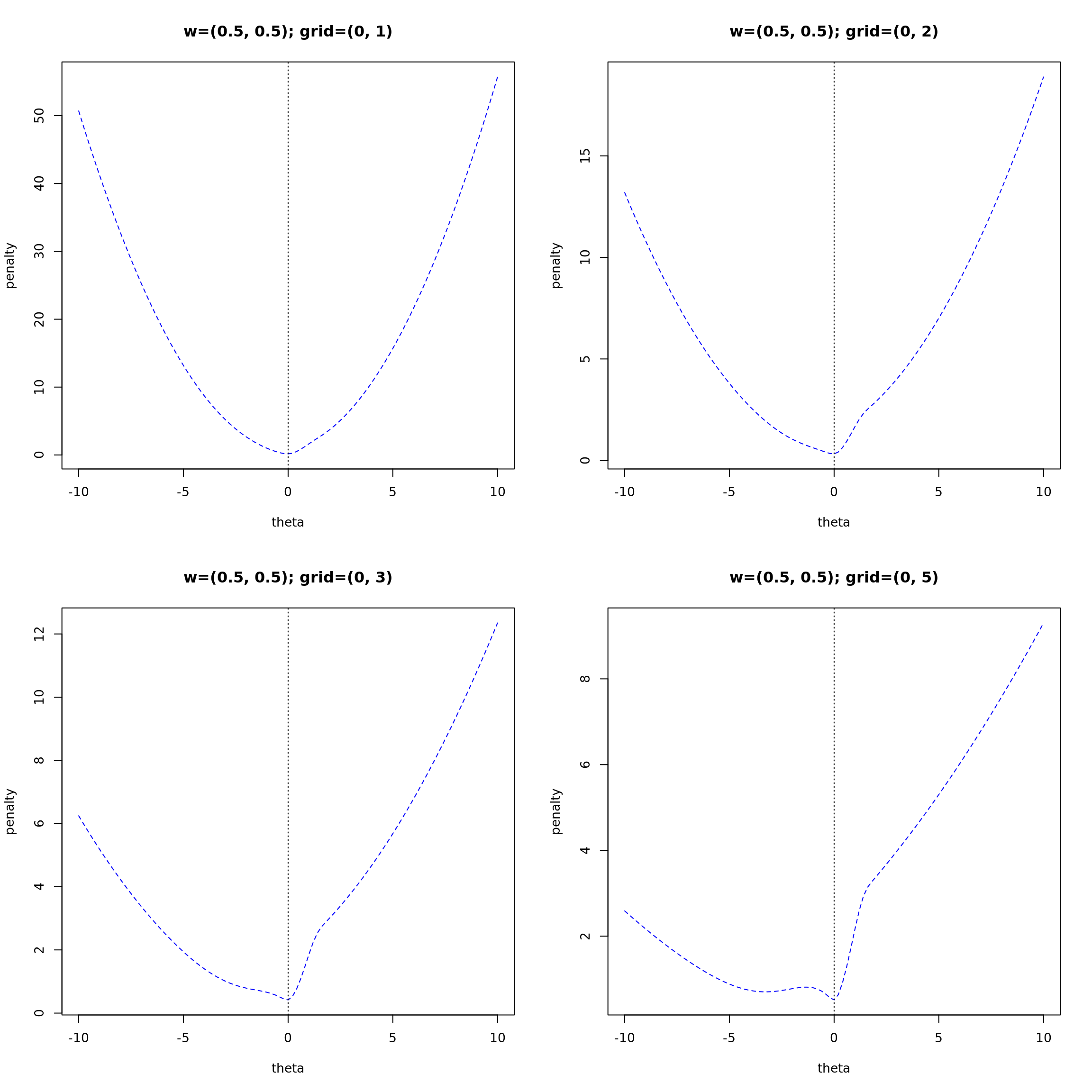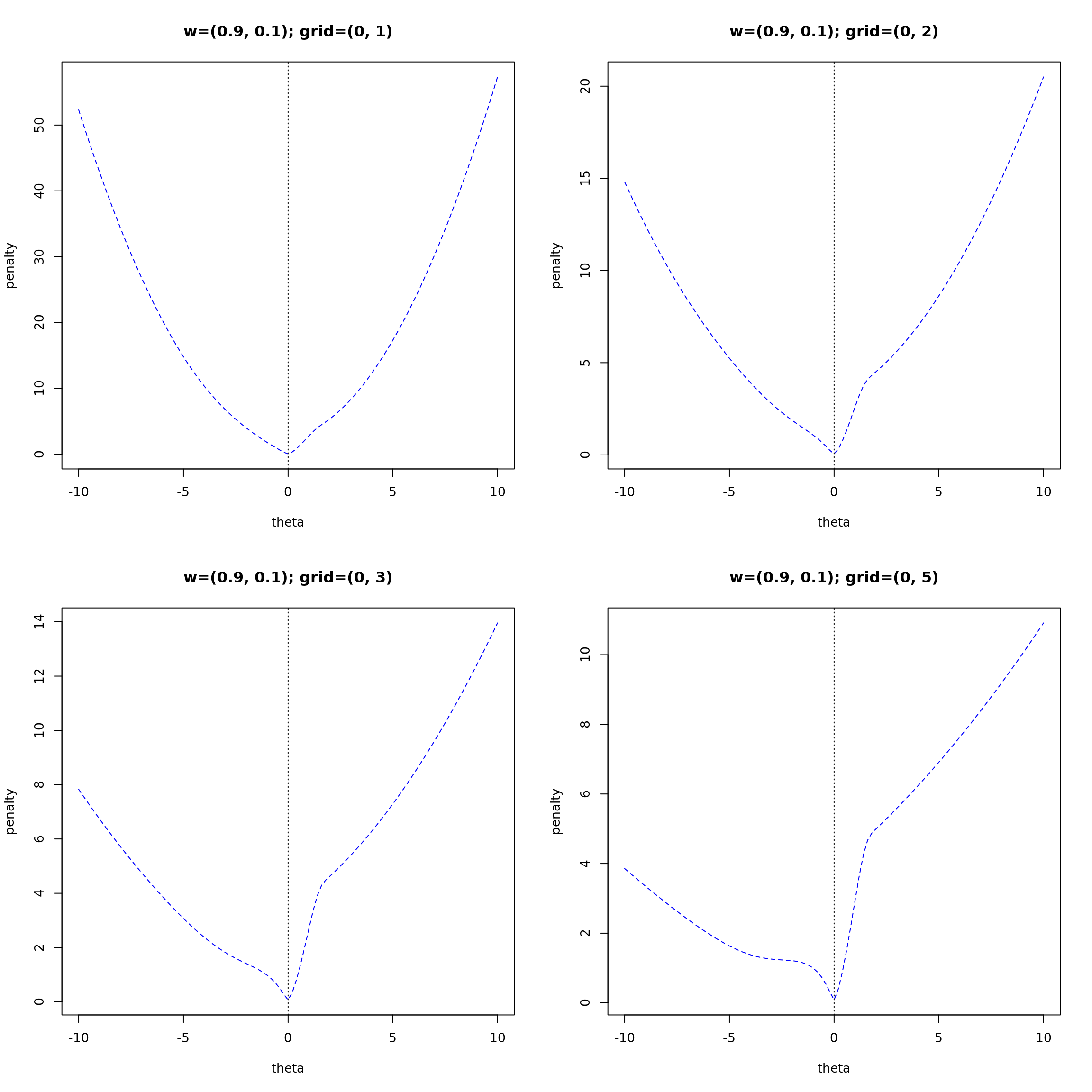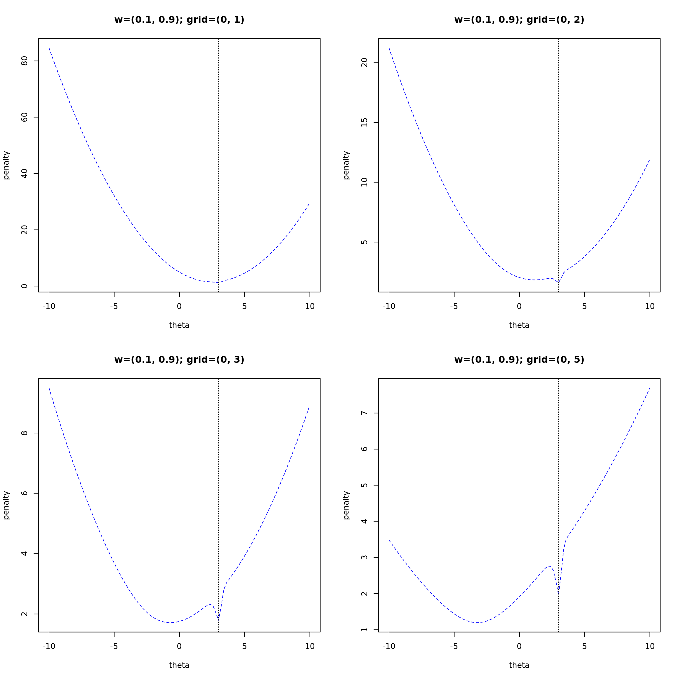 plot(x,pois_penalty(theta,w,mu,grid),col='blue',lty=2,type='l',xlab='theta',ylab='penalty',